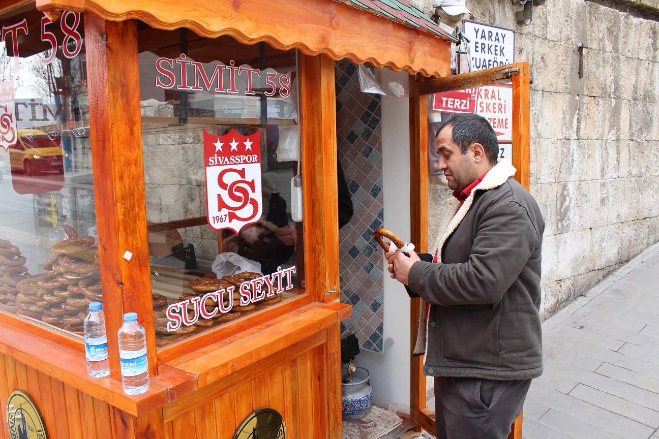Sivas'ta yıllardır simit satarak geçimini sağlayan Seyit Hiçer, Belediye Sokak'ta kurduğu tezgahıyla işini sürdürüyor. 10 TL"ye satılan simitleriyle gününü geçiren Seyit Hiçer, bu mesleği uzun zamandır severek yaptığını belirterek, "Allah bereket versin, ekmek paramızı çıkartıyoruz" dedi.