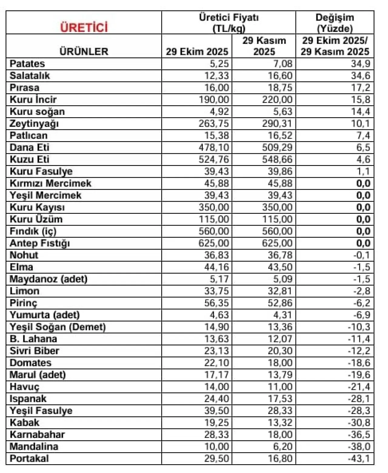 Türkiye Ziraat Odaları Birliği (TZOB), gıda fiyatlarındaki değişimi mercek altına alan ve 20 yıldır aralıksız sürdürülen Kasım ayı raporunu kamuoyuyla paylaştı. Masa başında değil, bizzat sahada ve 5 farklı bölgeden toplanan verilerle hazırlanan rapor, marketlerdeki fiyat hareketliliğine dair çarpıcı sonuçlar ortaya koydu. Rapora göre, Kasım ayında market raflarındaki 42 ürünün 24’ünde fiyat düşüşü gözlemlenirken, üretici ile market arasındaki makasın bazı ürünlerde rekor seviyeye ulaştığı görüldü.