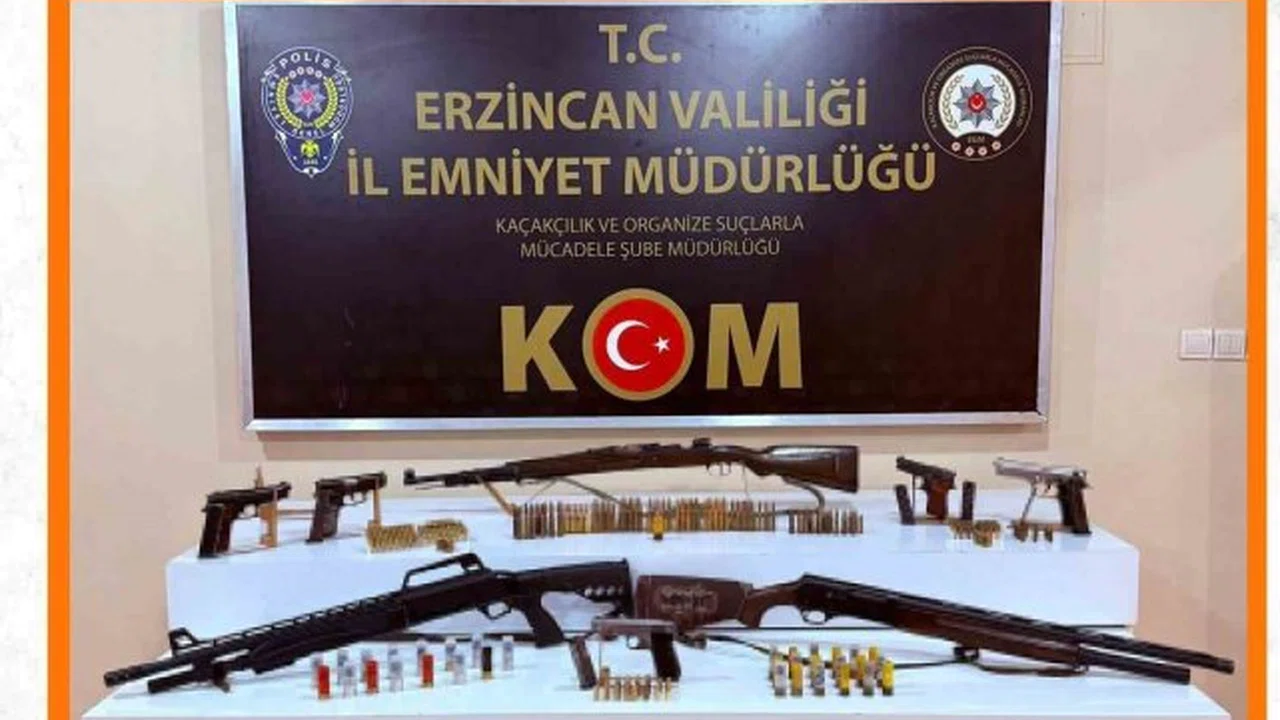 Erzincan İl Emniyet Müdürlüğü Kaçakçılık ve Organize Suçlarla Mücadele Şube Müdürlüğü ve Üzümlü İlçe Emniyet Amirliği personelince Erzincan genelinde 'Suçun Önlenmesi, Faillerin Tespiti, Şüphelilerin Yakalanması ve Suç Unsurlarının Ele Geçirilmesi' amacı ile yapılan çalışmalarda; N.Ö., İ.A., E.Ö., A.T, B.M., C.T., M.T. ve İ.A. isimli 8 şahsın ikametinde yapılan aramada; 5 adet ruhsatsız tabanca, 1 adet ruhsatsız mavzer tüfek, 2 adet ruhsatsız tüfek, 6 adet tabancalara ait şarjör, 205 adet tabancalara ait fişek, 33 adet tüfeklere ait kartuş, 81 adet uzun namlulu silahlara ait fişek, 1 adet AK-47 ele geçirildi.
