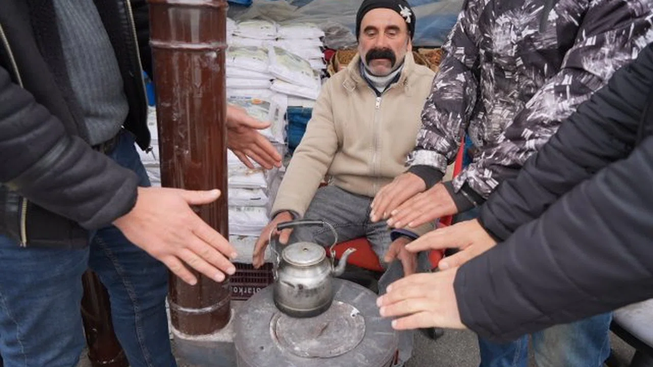 Erzincan'da pazarcı esnafı dondurucu soğuktan korunmak için tezgah arkasına soba kurdu.