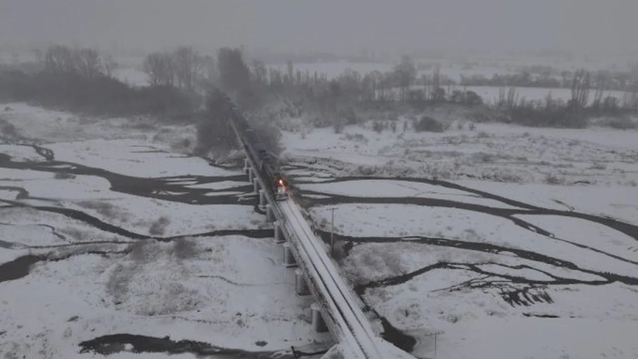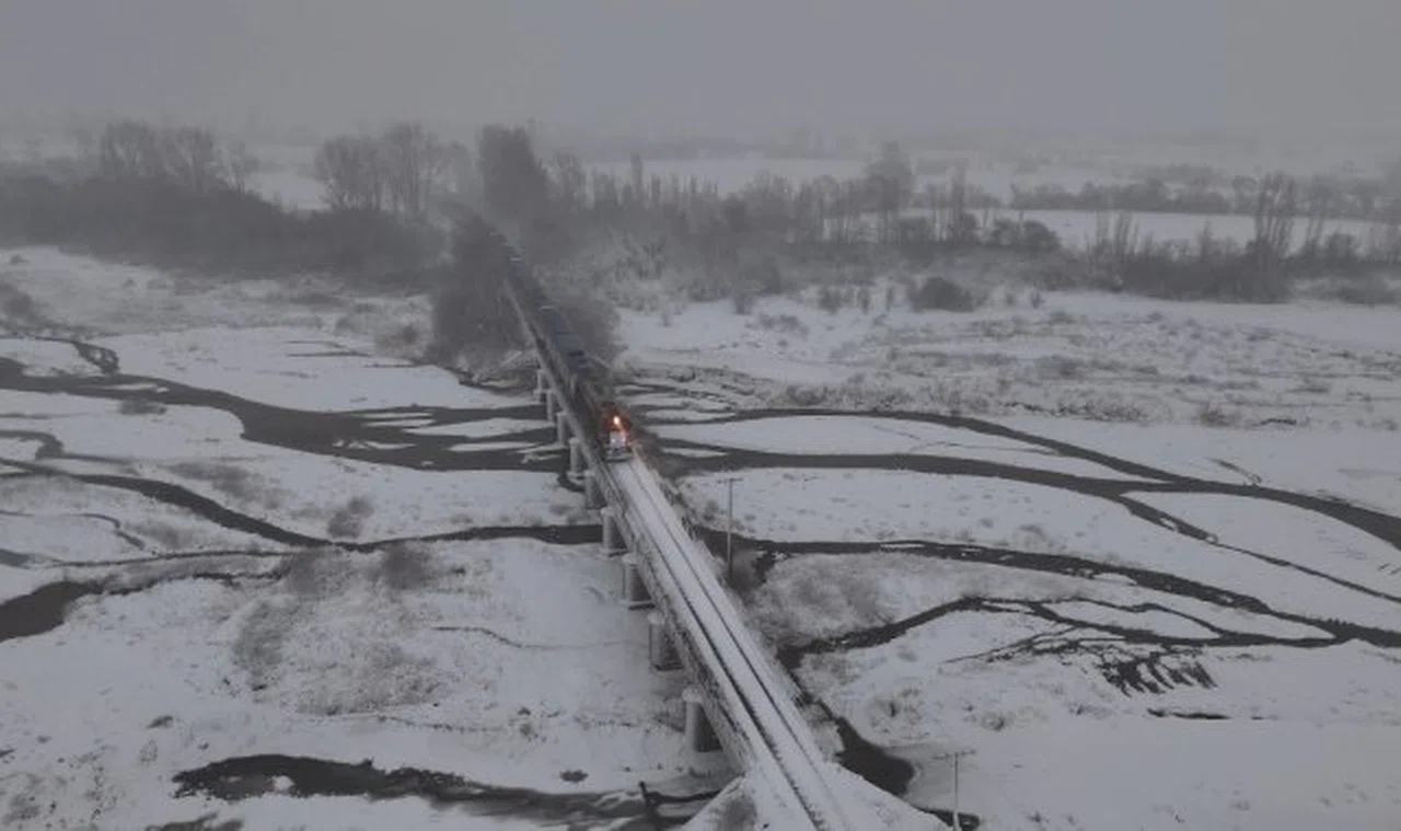 Erzincan'da yağan yoğun kar yağışının ardından her taraf beyaz örtüyle kaplanırken, Doğu Ekspresi treninin Beşsaray köyündeki Fırat Nehri üzerine kurulu köprü üzerinden geçişi masalsı görsel oluşturdu.