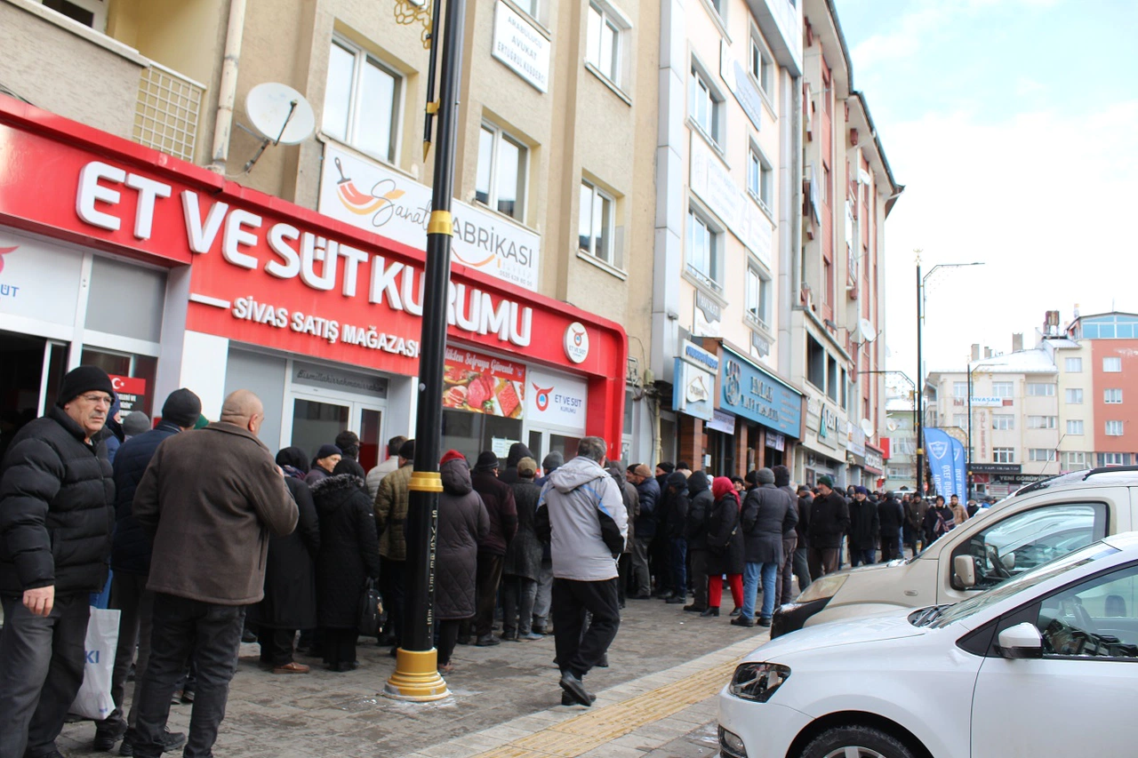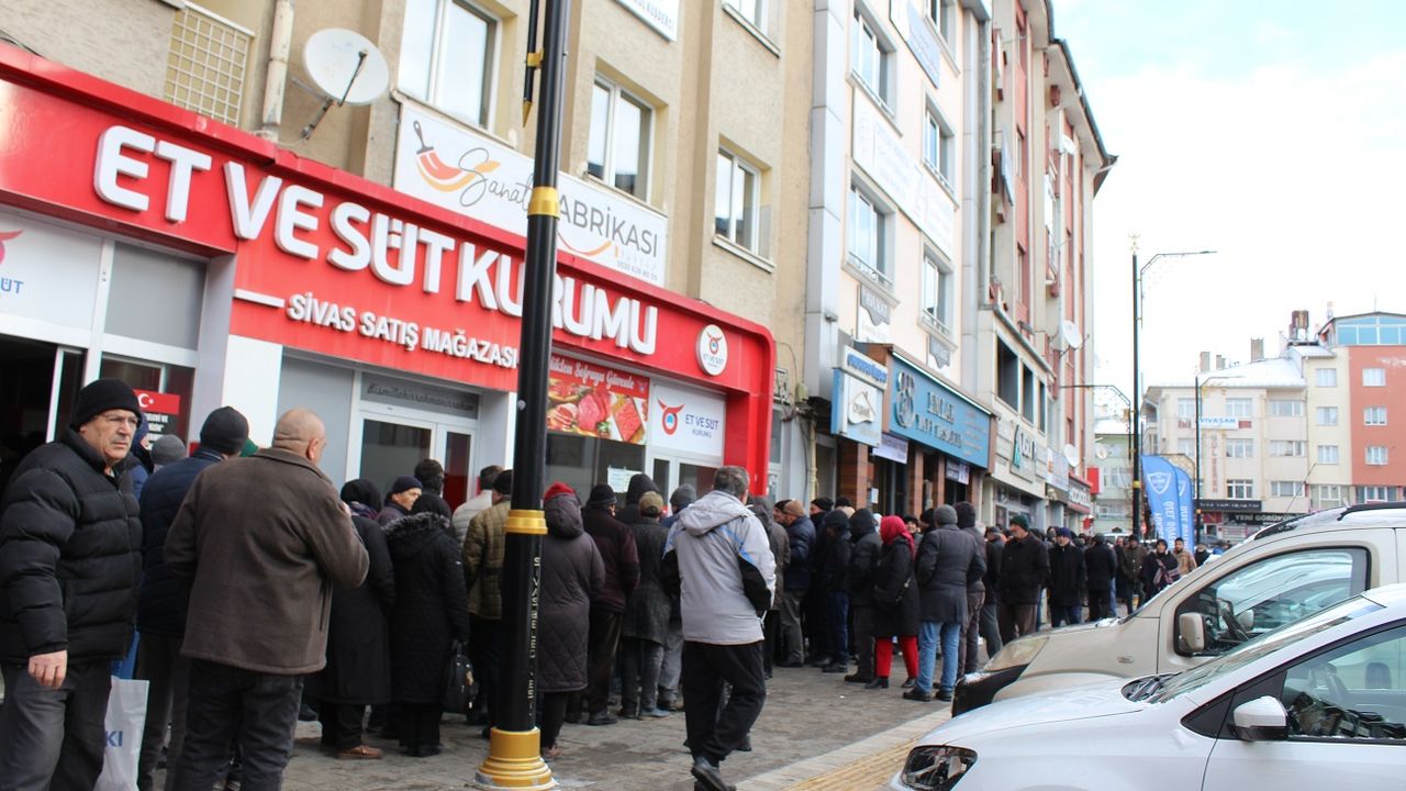 Sivas et ve süt kurumunda sabahın erken saatlerinden itibaren dev kuyruklar oluştu. Ramazan öncesi ete yapılan zamda: dana kıyma 460 TL den 500-550 TL ye, dana kuşbaşı ise 510 TL den 600 TL'ye yükseldi. Zamın ardından et ve süt kurumuna ilgi daha da arttı.