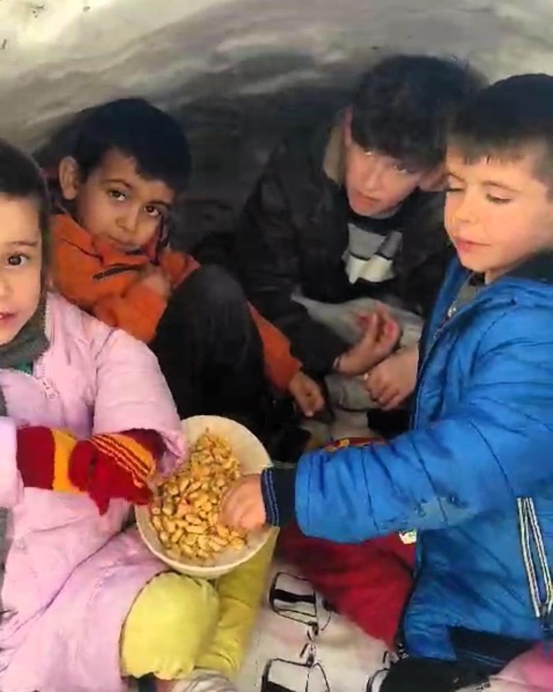 Yaptıkları kardan evin zeminine halı seren, ayakkabılarını çıkarıp içeri giren çocuklar, yanlarında getirdikleri yiyecekleri burada yiyerek keyifli anlar yaşadı. O anları kaydeden bir vatandaş, görüntüleri sosyal medya hesabından paylaşarak takipçileriyle buluşturdu.