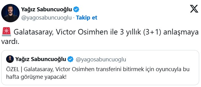 Sabuncuoğlu gün içerisinde yaptığı paylaşımda, Galatasaray’ın Osimhen ile bu hafta içinde bir araya geleceğini ve bonservis konusunda Napoli’yi ikna etmeye çalışacağını ifade etmişti. Son gelişmeye göre Galatasaray yönetimi, oyuncu cephesinden olumlu yanıt aldı.