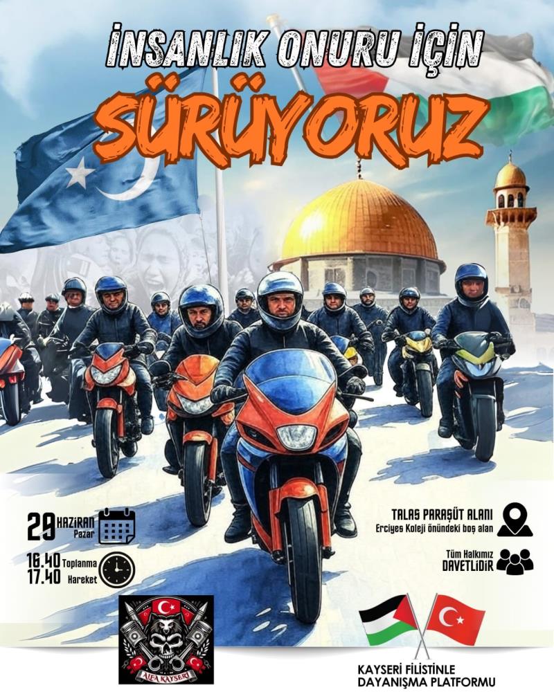 Filistin ve Doğu Türkistan’da yaşanan zulme dikkat çekmek amacıyla; Kayseri Alfa motosiklet sürücüleri 29 Haziran Pazar günü anlamlı bir konvoya imza atacak. Talas Paraşüt Alanı’nda saat 16.40’ta toplanacak olan motosiklet tutkunları; Filistin ve Türk bayraklarıyla donattıkları araçlarıyla saat 17.40’ta yola çıkacak. Konvoy; güzergâh boyunca Talas Caddesi ve Sivas Caddesi’ni takip ederek Kayseri Cumhuriyet Meydanı’na ulaşacak.
