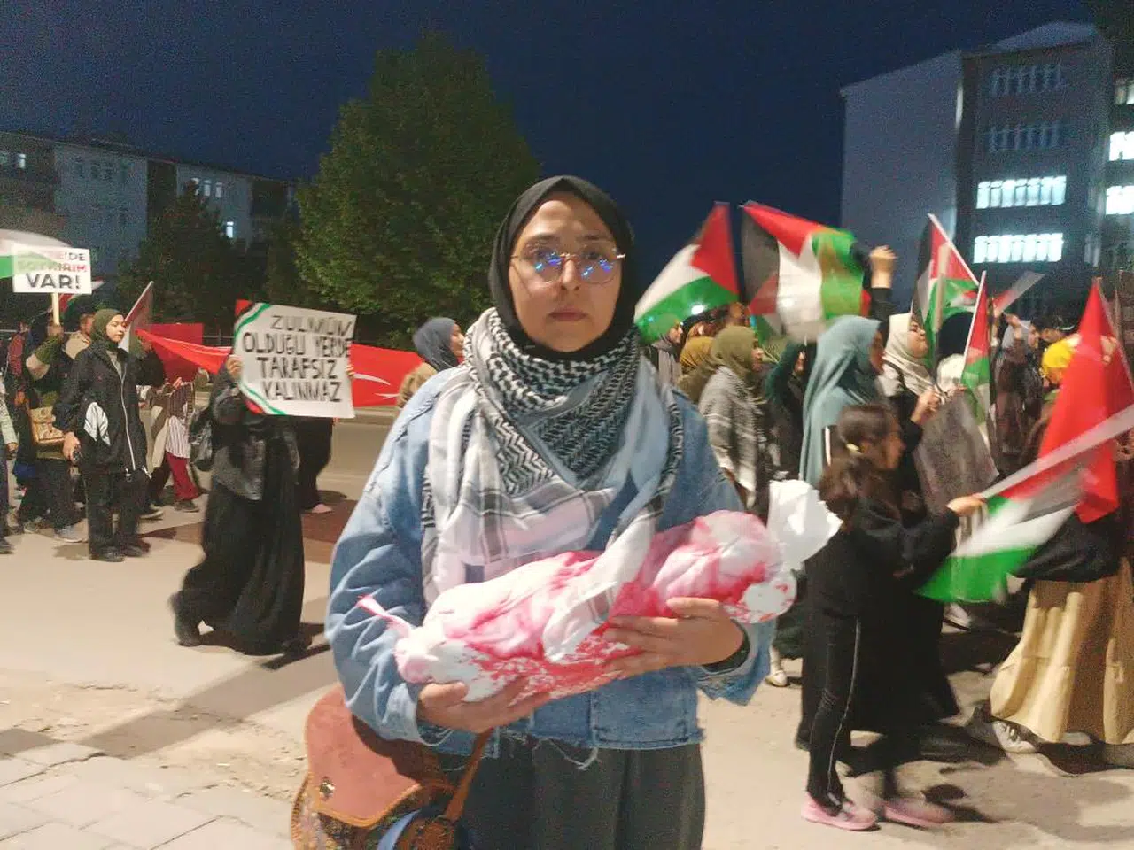 Yürüyüşte en dikkat çeken detay ise öğrencilerin taşıdığı kanlı oyuncak bebekler oldu. İsrail saldırılarında hayatını kaybeden bebekleri temsilen hazırlanan bu semboller, hem duygusal hem de görsel olarak güçlü bir mesaj verdi.