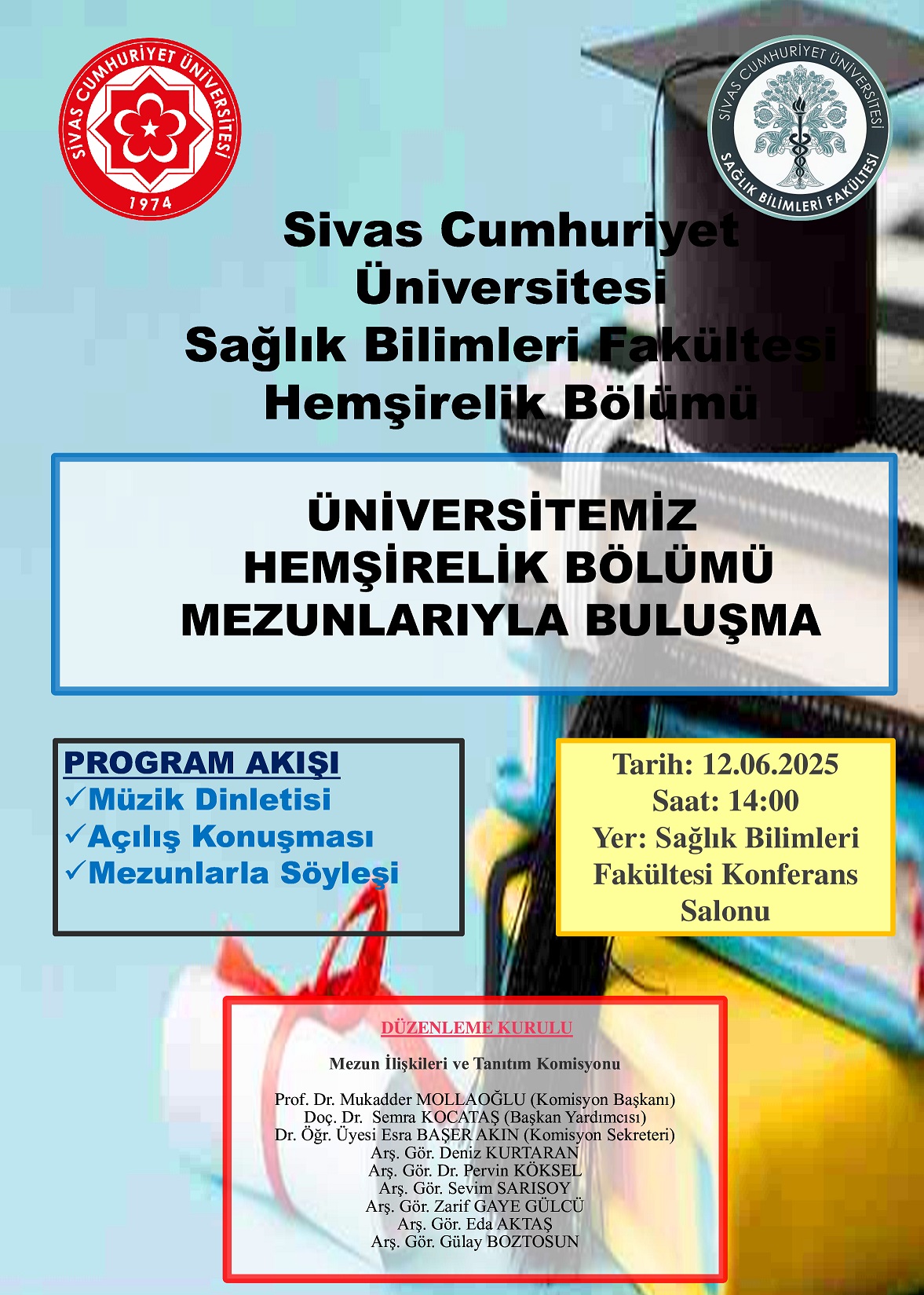 Sivas Cumhuriyet Üniversitesi (SCÜ) Sağlık Bilimleri Fakültesi, geçmişin tecrübesiyle geleceğin umudunu bir araya getiren son derece anlamlı bir etkinliğe imza atıyor. Hemşirelik Bölümü tarafından düzenlenen "Üniversitemiz Hemşirelik Bölümü Mezunlarıyla Buluşma" etkinliği, mesleğe yıllarını vermiş profesyonellerle, aynı yolda yürümeye hazırlanan öğrencileri buluşturacak.