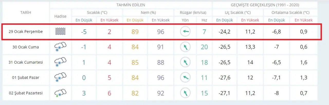 Hava durumu tahminlerindeki en ilginç detay ise geçmiş yıllardaki istatistiklerde saklı. 1991 ile 2020 yılları arasındaki verilere baktığımızda, Sivas'ta 29 Ocak tarihinde uç sıcaklıkların inanılmaz seviyelere ulaştığı görülüyor. Geçmişte bu tarihte termometreler tam -24,2 dereceyi görerek adeta hayatı durma noktasına getirmişti. Bugün beklenen -5 derecelik en düşük sıcaklık, kentin tarihi rekorlarına kıyasla çok daha "yumuşak" kalsa da, dondurucu etkisini korumaya devam ediyor. Ortalama sıcaklıkların genelde -6,8 seviyelerinde seyrettiği 29 Ocak günü, bu yıl ortalamanın biraz daha üzerinde bir seyir izleyecek gibi duruyor.