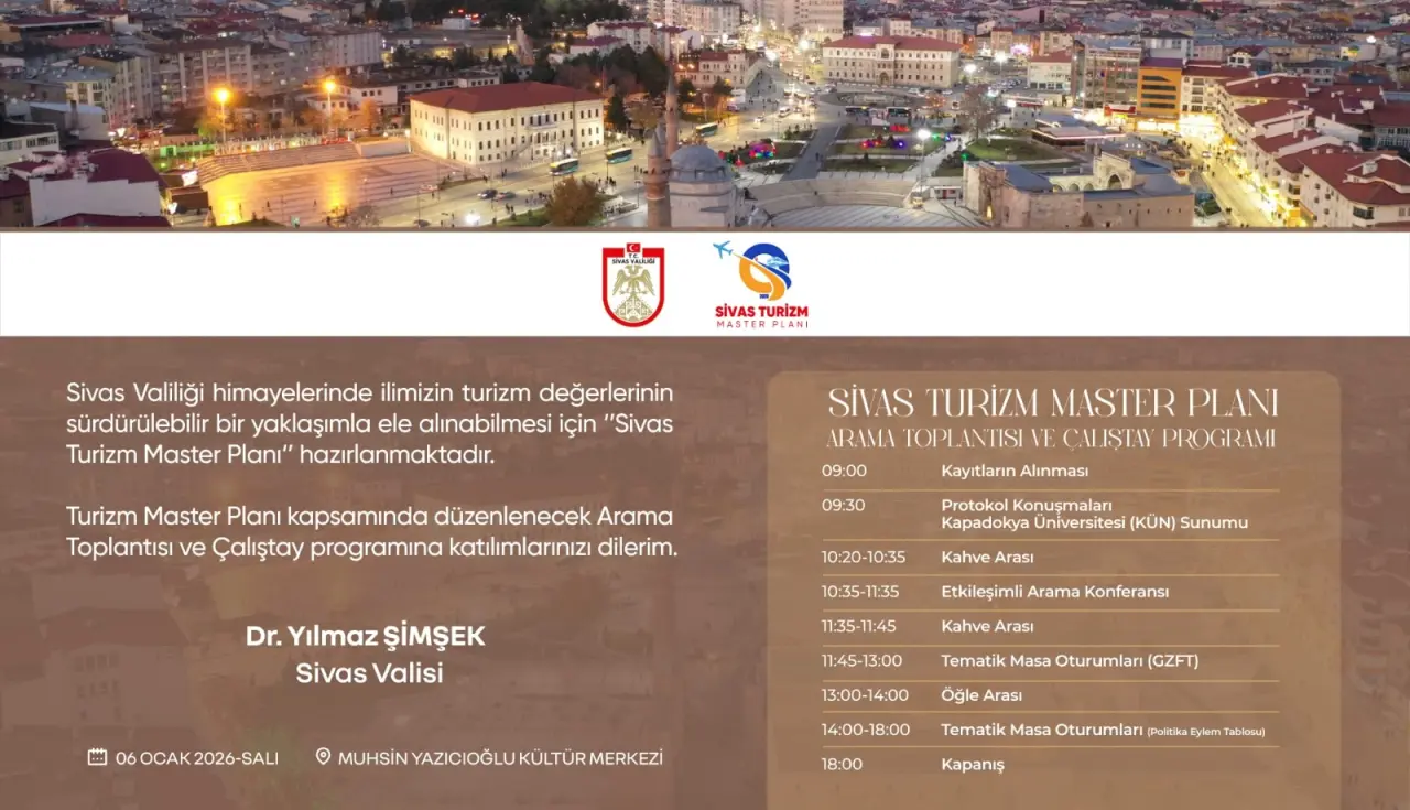 6 Ocak 2026 Salı günü gerçekleştirilecek olan Arama Toplantısı ve Çalıştay Programı, Sivas’ın turizm değerlerini koruyarak geleceğe taşımayı amaçlıyor. Muhsin Yazıcıoğlu Kültür Merkezi’nde düzenlenecek etkinlikte, şehrin hangi alanlarda atılım yapması gerektiği profesyonel bir ekiple değerlendirilecek. Sürdürülebilir bir yaklaşımın esas alındığı bu planla birlikte, Sivas’ın sadece bölgesel değil, uluslararası turizm pazarında da güçlü bir oyuncu haline gelmesi hedefleniyor.