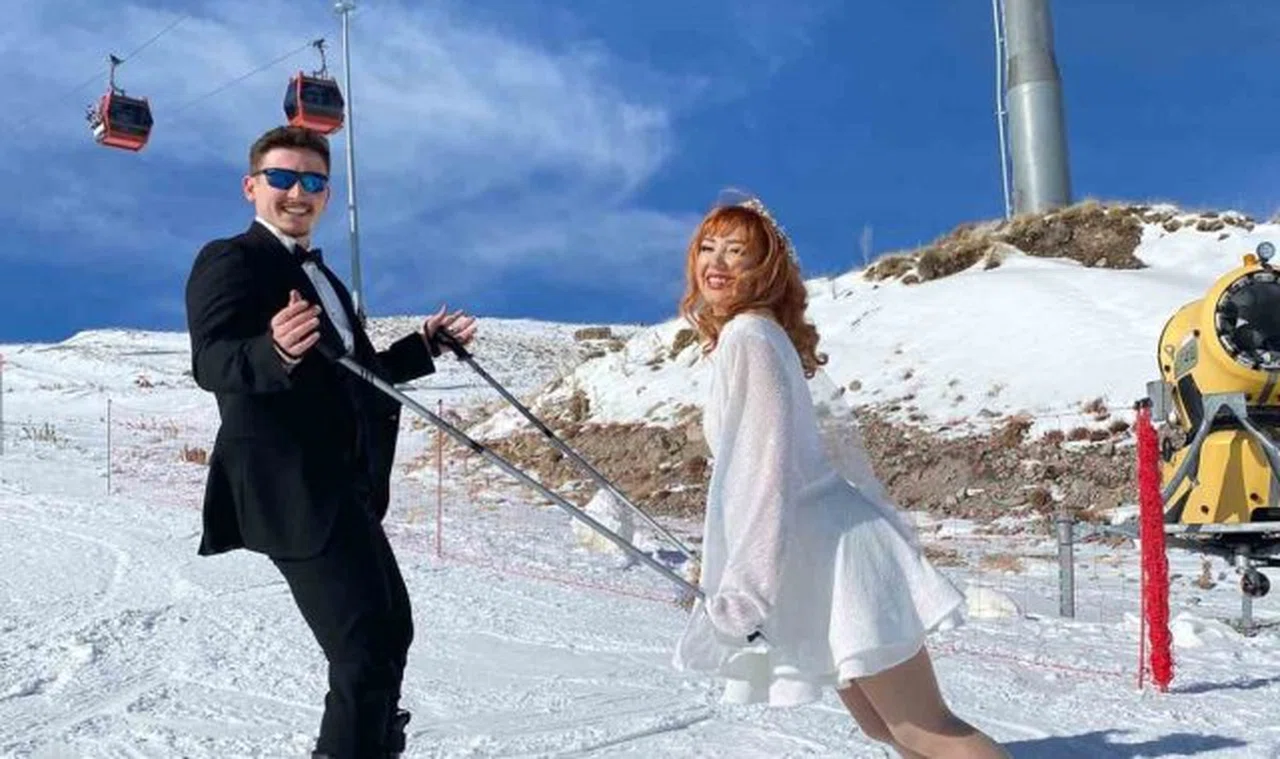 Türkiye'nin en önemli kayak merkezlerinden olan Erciyes Kayak Merkezi, yerli ve yabancı kayakseverleri ağırlamaya devam ediyor. Sezonu erken açan ve farklı zorluk dereceleriyle herkese hitap eden pistler, turistlerle dolup taşarken, bugün düğünü olacak Kayak eğitmeni Tuğba Pelit ile Şamil Soykuvvet çiftini ağırladı. Düğün öncesi Erciyes Kayak Merkezi'ne gelen çift, gelinlik ve damatlıkla kayak yaptı.