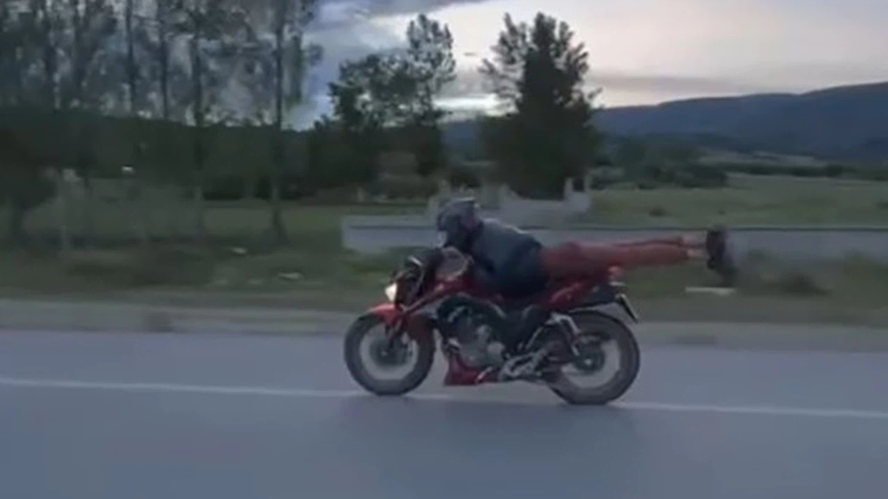 Sürücünün kask takmasına rağmen, motosiklet üzerinde yaptığı bu akrobatik hareket sosyal medyada da tepki topladı. Bir süre bu şekilde ilerleyen sürücü daha sonra gözden kayboldu.