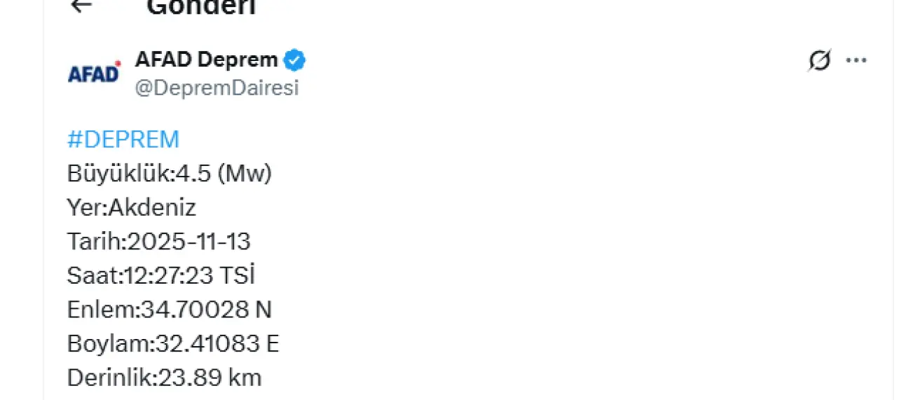 AFAD’ın açıklamasına göre deprem, 13 Kasım 2025 tarihinde 12:27:23’te meydana geldi. 4.5 (Mw) büyüklüğündeki sarsıntının merkez üssü Akdeniz olarak kaydedildi.