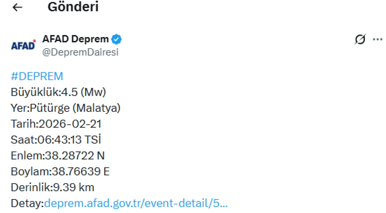 Deprem, 21 Şubat 2026 tarihinde saat 06:43:13’te meydana geldi. Merkez üssünün Malatya’nın Pütürge ilçesi olduğu bildirildi. Yerin 9,39 kilometre derinliğinde gerçekleşen depremin enlem değeri 38.28722 N, boylam değeri ise 38.76639 E olarak kaydedildi.