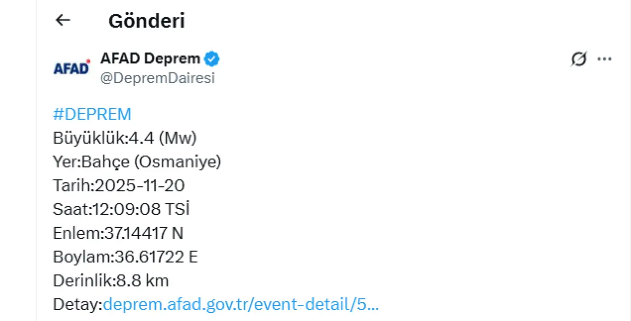 Afet ve Acil Durum Yönetimi Başkanlığı (AFAD), Osmaniye’nin Bahçe ilçesinde 4,4 büyüklüğünde deprem meydana geldiğini açıkladı. AFAD Deprem Dairesi’nin verilerine göre sarsıntı 20 Kasım 2025 günü saat 12:09:08’de kaydedildi.