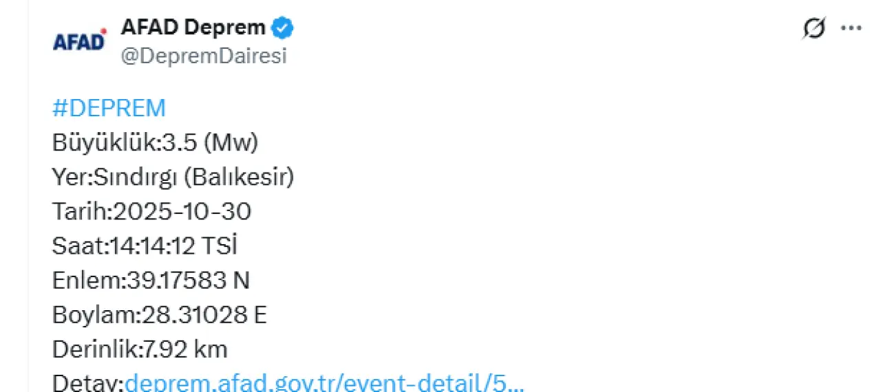 Balıkesir yeniden sallandı! AFAD verilerine göre, Balıkesir’in Sındırgı ilçesinde 3.5 büyüklüğünde bir deprem meydana geldi. Sarsıntı, 30 Ekim 2025 tarihinde saat 14:14’te kaydedildi. Depremin 7.92 kilometre derinlikte gerçekleştiği bildirildi.