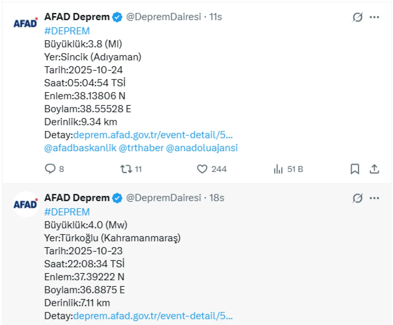 AFAD verilerine göre ilk deprem, 23 Ekim 2025 tarihinde saat 22:08:34’te, yerin 7.11 kilometre derinliğinde meydana geldi. İkinci deprem ise 24 Ekim 2025 sabahı saat 05:04:54’te, yaklaşık 9.34 kilometre derinlikte kaydedildi.