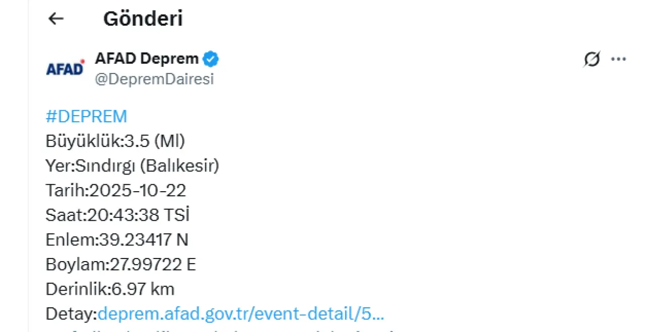 AFAD verilerine göre, 22 Ekim 2025 tarihinde saat 20:43:38’de gerçekleşen depremin derinliği 6.97 kilometre olarak ölçüldü. Depremin merkez üssü Sındırgı (Balıkesir) olurken, çevre ilçelerde de hafif şekilde hissedildi.