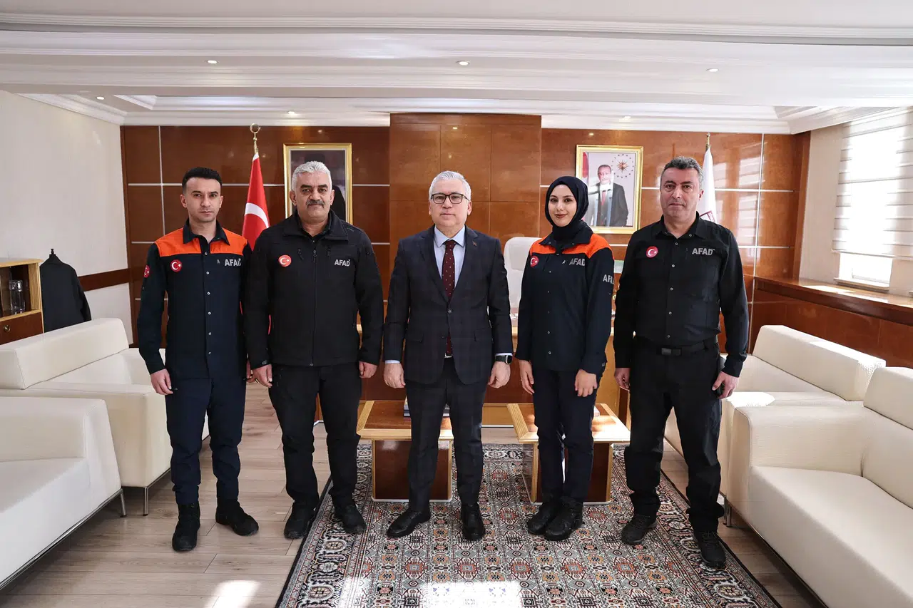 Sivas Valisi Yılmaz Şimşek, Afet ve Acil Durum Yönetimi Başkanlığı’nın (AFAD) 16’ncı kuruluş yıl dönümü vesilesiyle Sivas İl Afet ve Acil Durum Müdürü Cemal Kurban ve beraberindeki yönetici heyetini makamında ağırladı. Gerçekleşen ziyaret, afet ve acil durum hazırlıkları konusundaki yerel koordinasyonun önemini vurgulayan anlamlı bir buluşma olarak kayıtlara geçti.