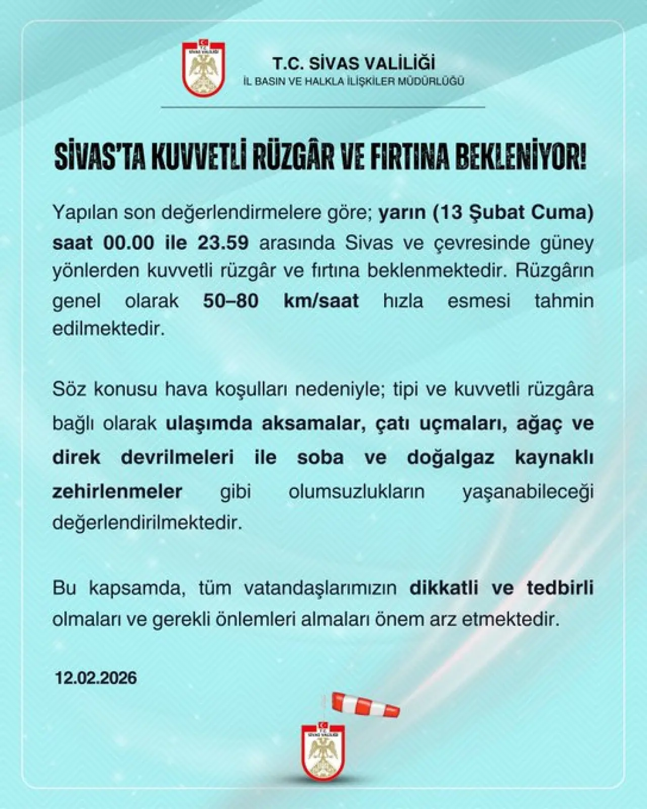 Sivas Valiliği, kent genelinde beklenen kuvvetli rüzgâr ve fırtına nedeniyle vatandaşlara önemli bir uyarıda bulundu. Yapılan son meteorolojik değerlendirmelere göre 13 Şubat Cuma günü saat 00.00 ile 23.59 arasında Sivas ve çevresinde güney yönlerden kuvvetli rüzgâr ve fırtına etkili olacak.