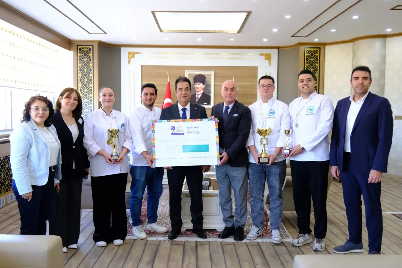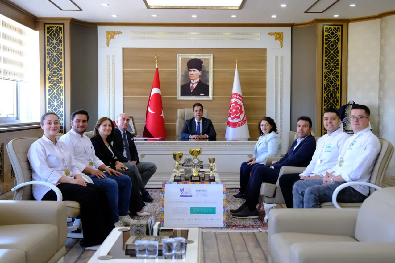 Sivas Cumhuriyet Üniversitesi Turizm Fakültesi Gastronomi ve Mutfak Sanatları Bölümü öğrencilerinden oluşan Genç Şefler Takımı, 9. Uluslararası Adana Lezzet Festivali’nde kazandıkları birincilik ve altın madalya ile üniversitelerine büyük bir gurur yaşattı. Yarışmadan zaferle dönen ekip, Rektör Prof. Dr. Ahmet Şengönül tarafından makamında kabul edilerek onurlandırıldı.