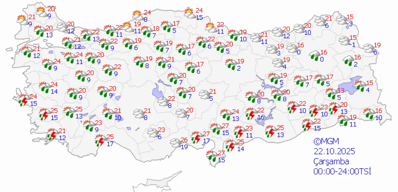 MGM'nin son verilerine göre, 22 Ekim Çarşamba günü Sivas'ta gökyüzü tamamen açık olmayacak. Gün boyunca aralıklı olarak kendini gösterecek olan parçalı bulutlu hava, beraberinde yağış geçişlerini de getirecek. Yayınlanan haritada Sivas için "parçalı bulutlu ve hafif sağanak yağışlı" bir hava öngörülüyor. Özellikle öğle saatlerinden sonra ve akşam saatlerine doğru, il genelinde yer yer hafif sağanak yağış bekleniyor. Bu yağışların şiddetli bir fırtına şeklinde olması beklenmese de, ani bastırabilecek geçişlere karşı tedbirli olmakta fayda var. Uzmanlar, Sivaslıların güne hazırlıksız yakalanmamak için yanlarına şemsiye almalarını tavsiye ediyor.
