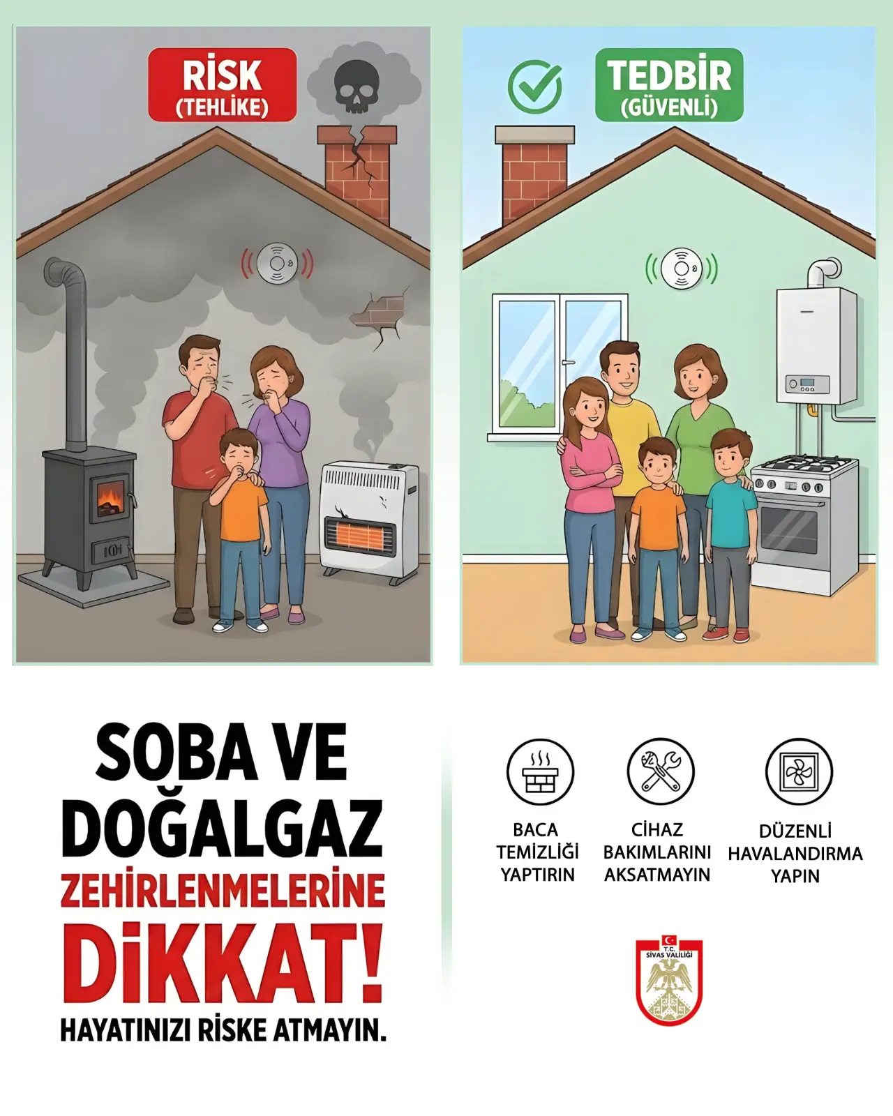 Sivas genelinde ısınma amaçlı soba ve doğalgaz kullanımının artmasıyla birlikte, baca gazı zehirlenmesi riski de yükseldi. Sivas Valiliği, sosyal medya üzerinden yaptığı duyuru ile vatandaşların muhtemel risklere karşı tedbirli ve dikkatli olması gerektiğini hatırlattı. Karbonmonoksit zehirlenmelerinin önüne geçmek için özellikle kombi, soba ve bacaların bakım ve temizliğinin aksatılmadan yapılması gerektiği bildirildi. Valilik, bacaların çekiş gücünün periyodik olarak kontrol edilmesini ve her türlü sızıntı ihtimaline karşı tetikte olunmasını istiyor.