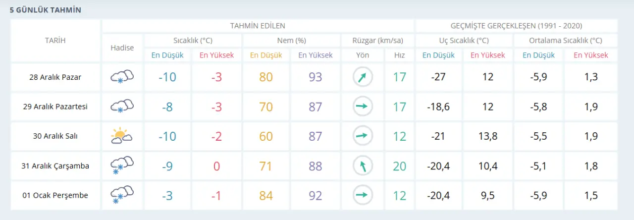 Meteoroloji verilerine göre 29 Aralık Pazartesi günü Sivas genelinde kar yağışı, sis ve buzlanma etkili olacak. Özellikle sabah ve gece saatlerinde ulaşımda aksamalar yaşanabileceği uyarısı yapıldı. Geçmiş yıllarda benzer hava şartlarında alınan tatil kararları, bu tarih için de beklentiyi artırıyor.