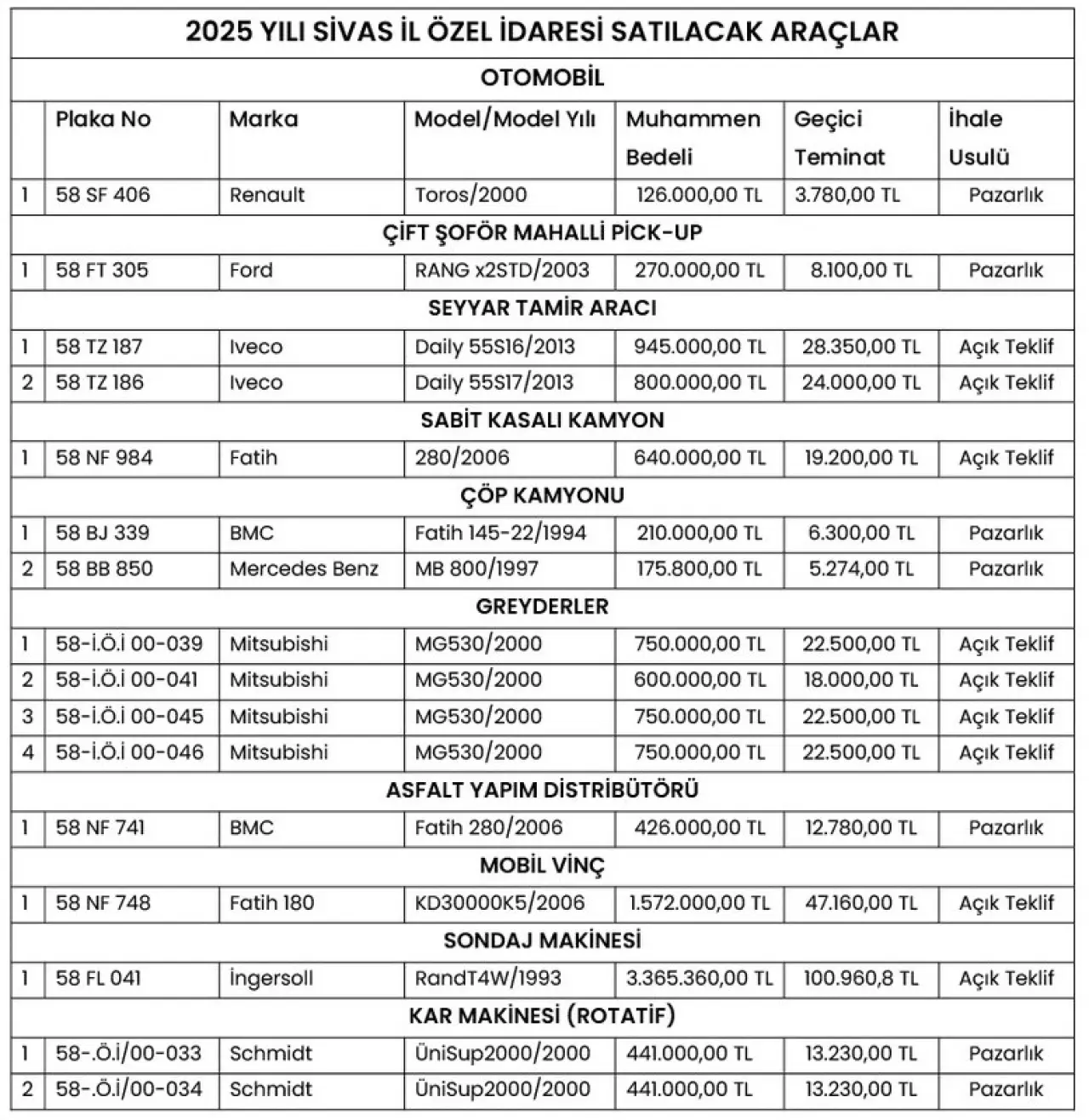 Sivas İl Özel İdaresi, filosunda bulunan bazı araçları satışa çıkarıyor. 2886 sayılı Devlet İhale Kanunu kapsamında gerçekleştirilecek olan ihaleler, hem açık teklif usulü hem de pazarlık usulüyle yapılacak. Araç satışları, belirlenen muhammen bedeller üzerinden teklif alımı sonrası tamamlanacak.
