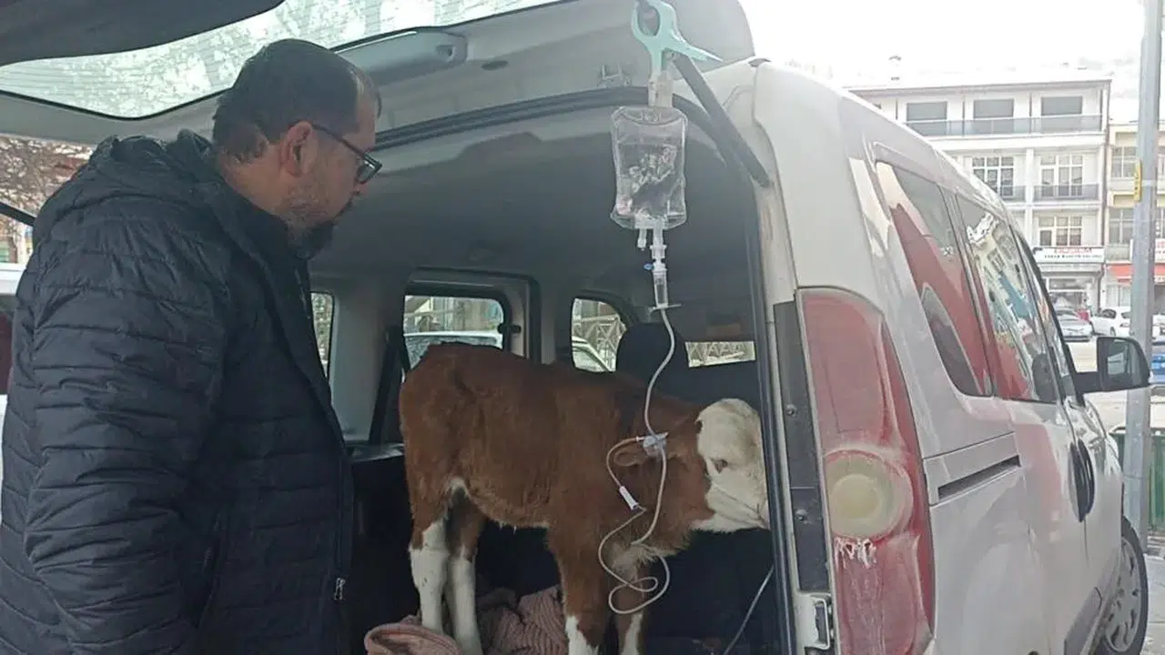 Veteriner hekim Bülent Köse, kliniğe ulaşılamadan yapılan acil durum çağrısı üzerine vakaya otomobilin bagajında müdahale etti. Buzağıya hemen damar yolu açıldı, gerekli ilaçlar verildi ve maske yardımıyla oksijen desteği sağlandı. Zorlu geçen müdahale sırasında çevredeki vatandaşlar da büyük bir endişeyle yaşananları takip etti. Yapılan hızlı ve yerinde müdahale sayesinde buzağının hayata tutunduğu öğrenildi.