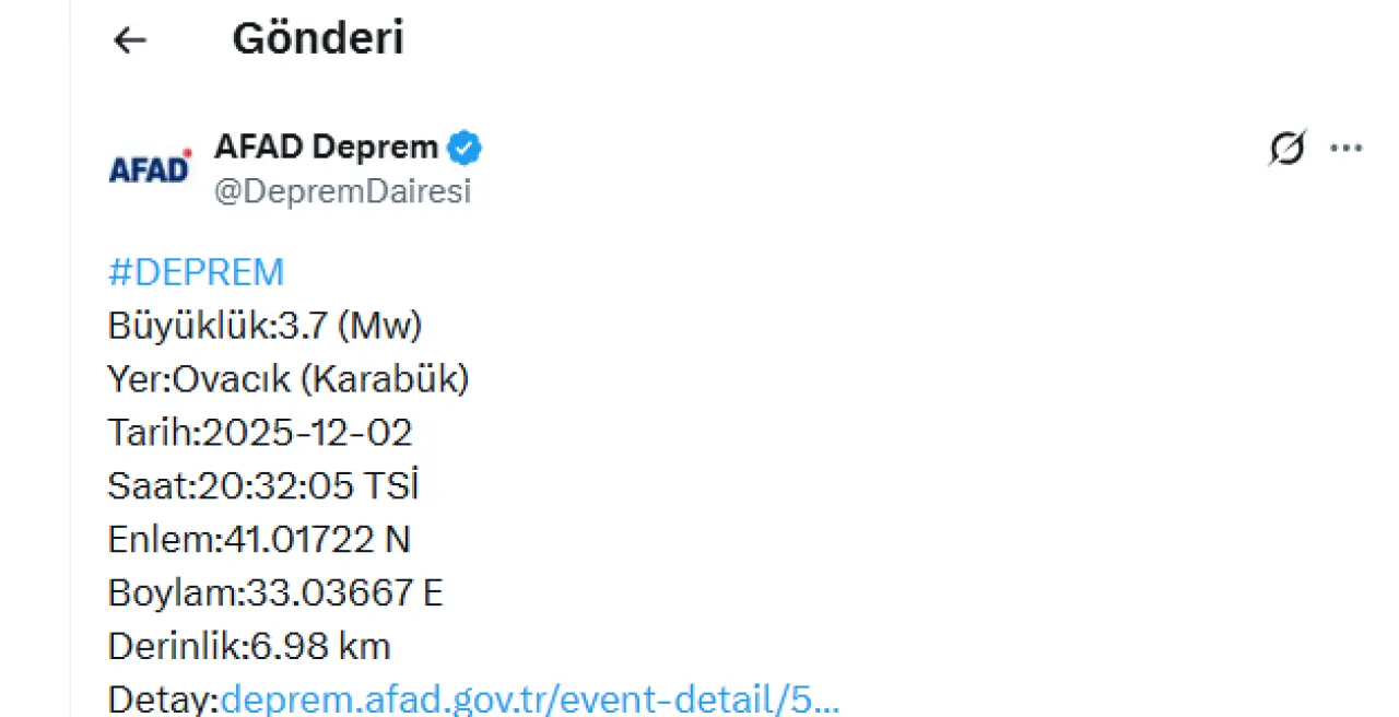 AFAD, 2 Aralık 2025 tarihinde Karabük’ün Ovacık ilçesinde meydana gelen depremle ilgili bilgileri paylaştı. Kurumun resmi açıklamasına göre saat 20:32:05 TSi’de meydana gelen sarsıntının büyüklüğü 3.7 (Mw) olarak ölçüldü.