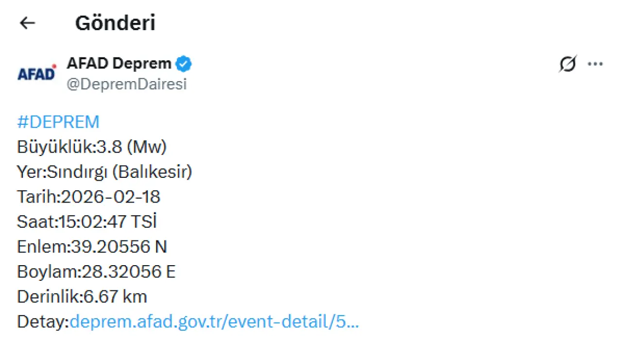 Afet ve Acil Durum Yönetimi Başkanlığı’nın açıkladığı verilere göre sarsıntının büyüklüğü 3.8 (Mw) olarak ölçüldü. Deprem 18 Şubat 2026 tarihinde saat 15:02:47 (TSİ)’de kaydedilirken, yerin yaklaşık 6.67 kilometre derinliğinde gerçekleştiği bildirildi.