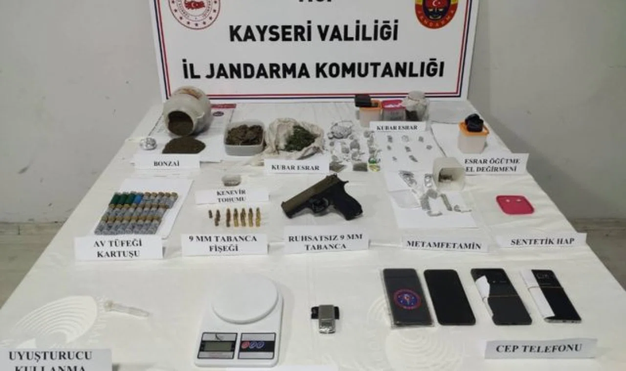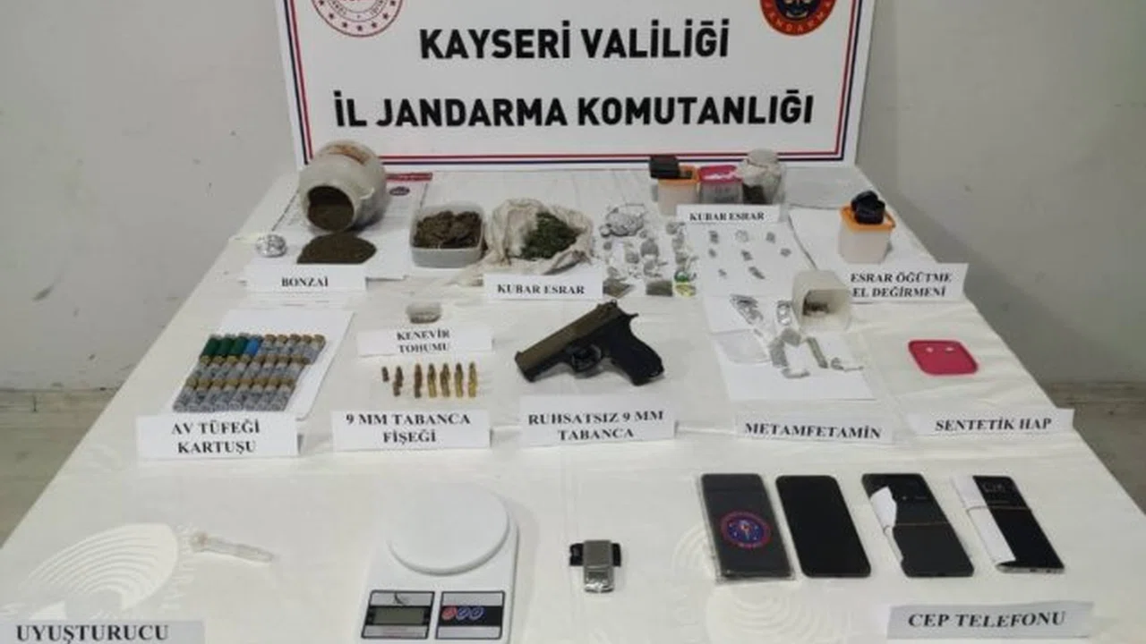 Jandarma ekipleri tarafından 3 ilçede 5 adrese yapılan arama çalışmalarında 856 gram uyuşturucu madde, 3 adet sentetik hap, 2 adet hassas terazi, 5 adet uyuşturucu kullanma aparatı, 1 adet esrar öğütme el değirmeni, 1 adet ruhsatsız 9 tabanca, 1 adet tabanca şarjörü, 14 adet 9 mm tabanca fişeği, 5 adet 7.65 mm çapında tabanca fişeği, 25 adet av tüfeği kartuşu ve 8 adet cep telefonu ele geçirildi.