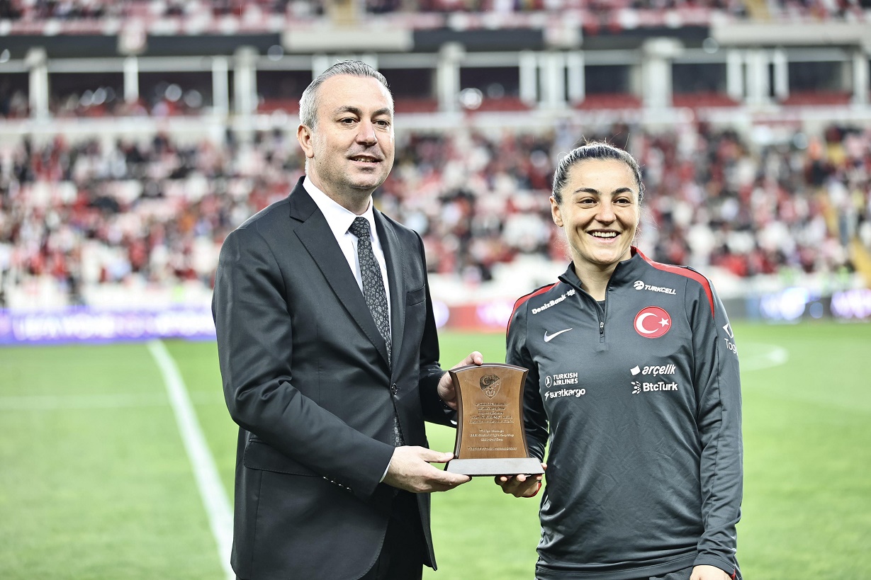 Karşılaşma öncesinde duygusal bir an yaşandı. Millî formayı 100. kez giyme gururunu yaşayan tecrübeli savunma oyuncusu Didem Karagenç’e özel bir plaket takdim edildi. Bu anlamlı plaketi, Sivas Belediye Başkanı Adem Uzun takdim ederek Karagenç’i bu önemli başarısından dolayı tebrik etti.