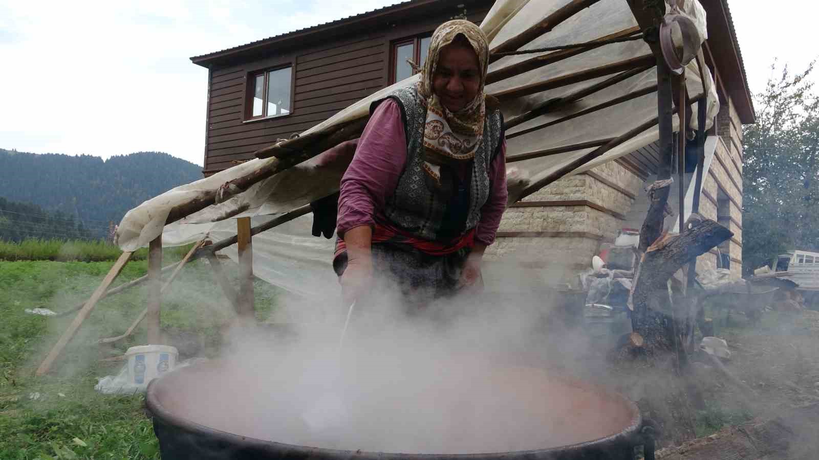 Kışın önemli hazırlıklarından biri olan pekmez yapımını anlatan Emine Yüksel, "Kışın en çok ihtiyaç duyduğumuz pekmez oluyor. Bu sene elma ve armut bol. Bu meyvelerden pekmez yapmaya devam ediyoruz. Meyvelerin önce yıkanıp kaynatılıyor, ardından suyu süzülüyor ve tekrar kaynatılarak koyulaştırılarak pekmez kıvamına getiriliyor" dedi.