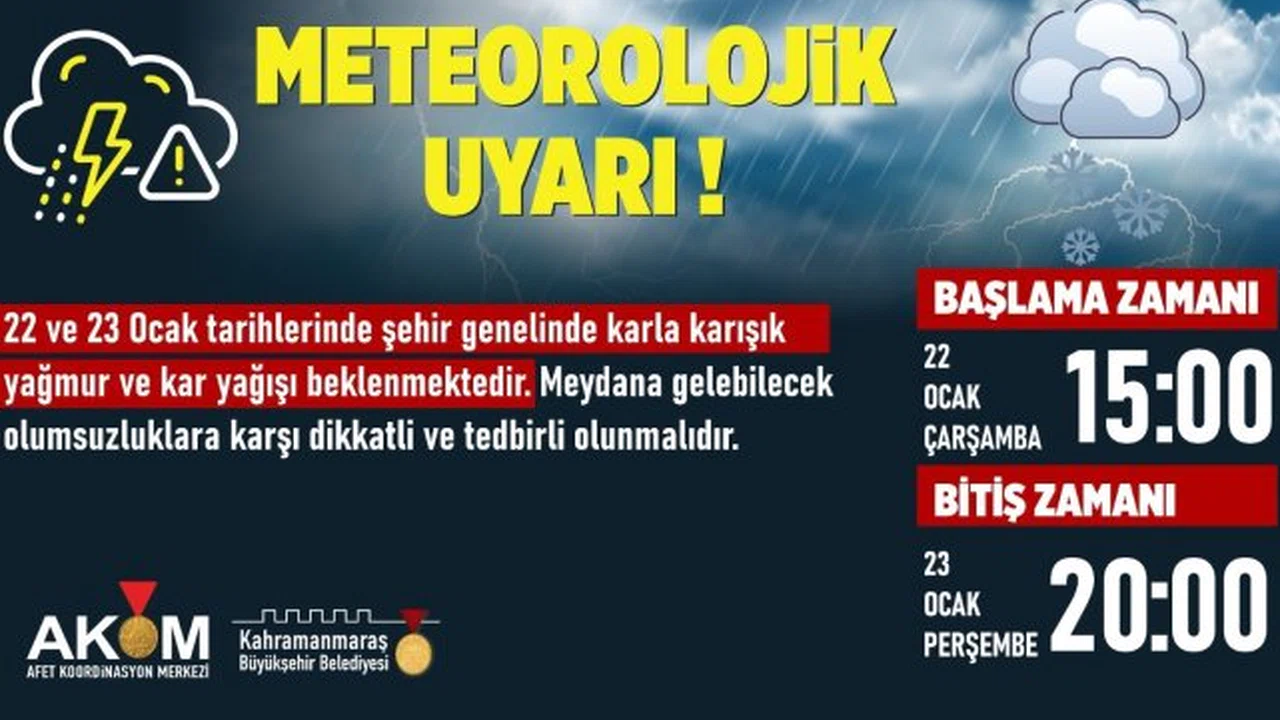 Kahramanmaraş'ta 22 ve 23 Ocak tarihlerinde şehir genelinde etkili olması beklenen karla karışık yağmur ve kar yağışına karşı dikkatli ve tedbirli olunması noktasında vatandaşlar uyarıldı.