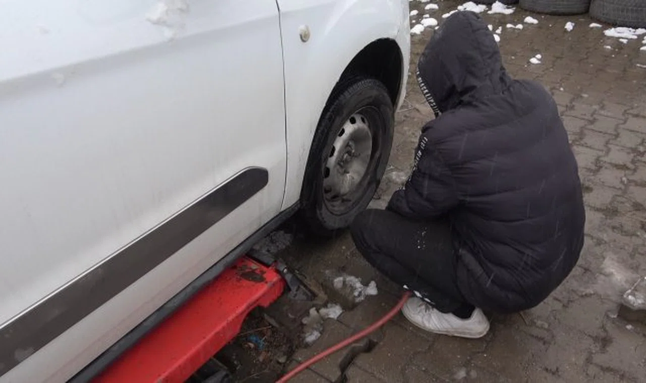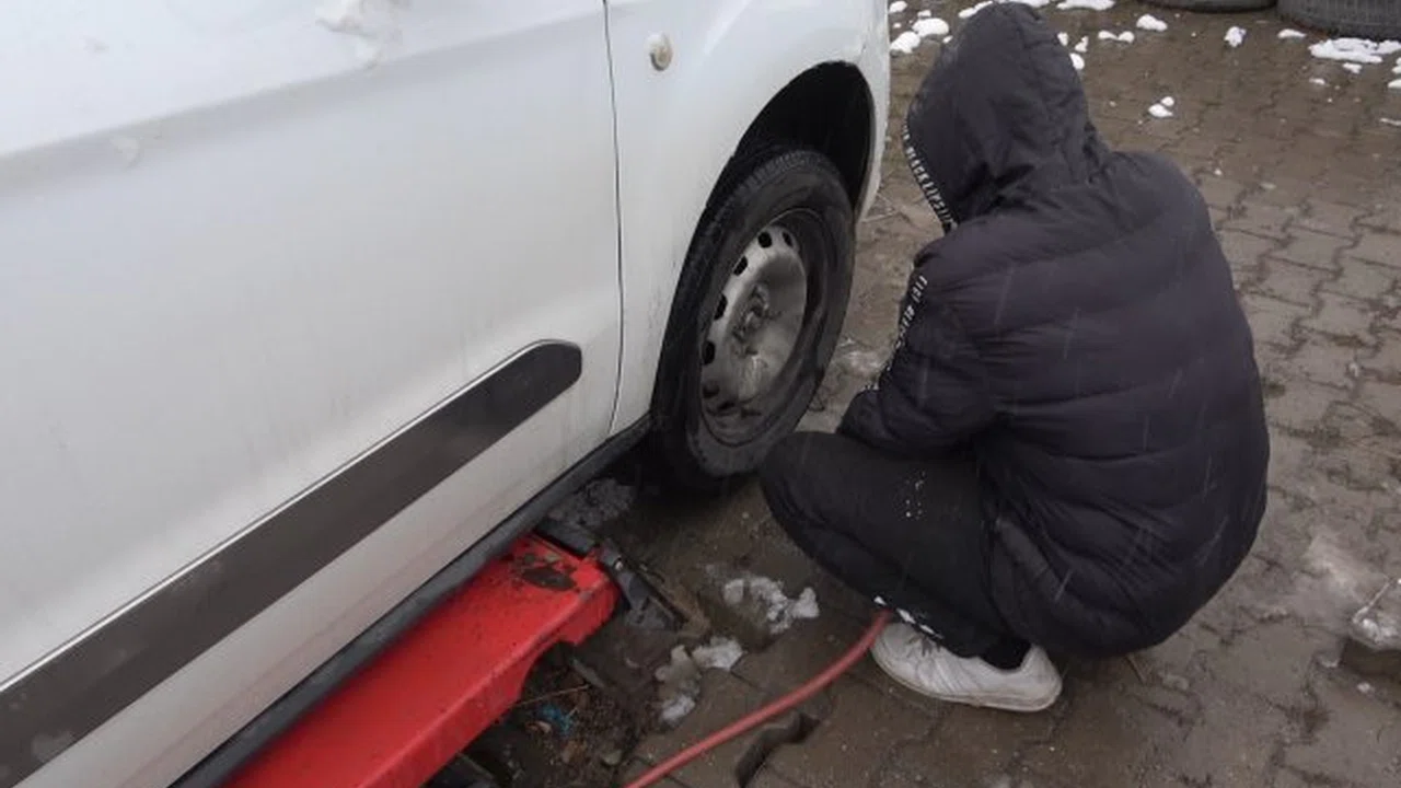 Yozgat'ta yoğun şekilde başlayan kar yağışı, lastikçilerde yoğunluk oluşturdu.