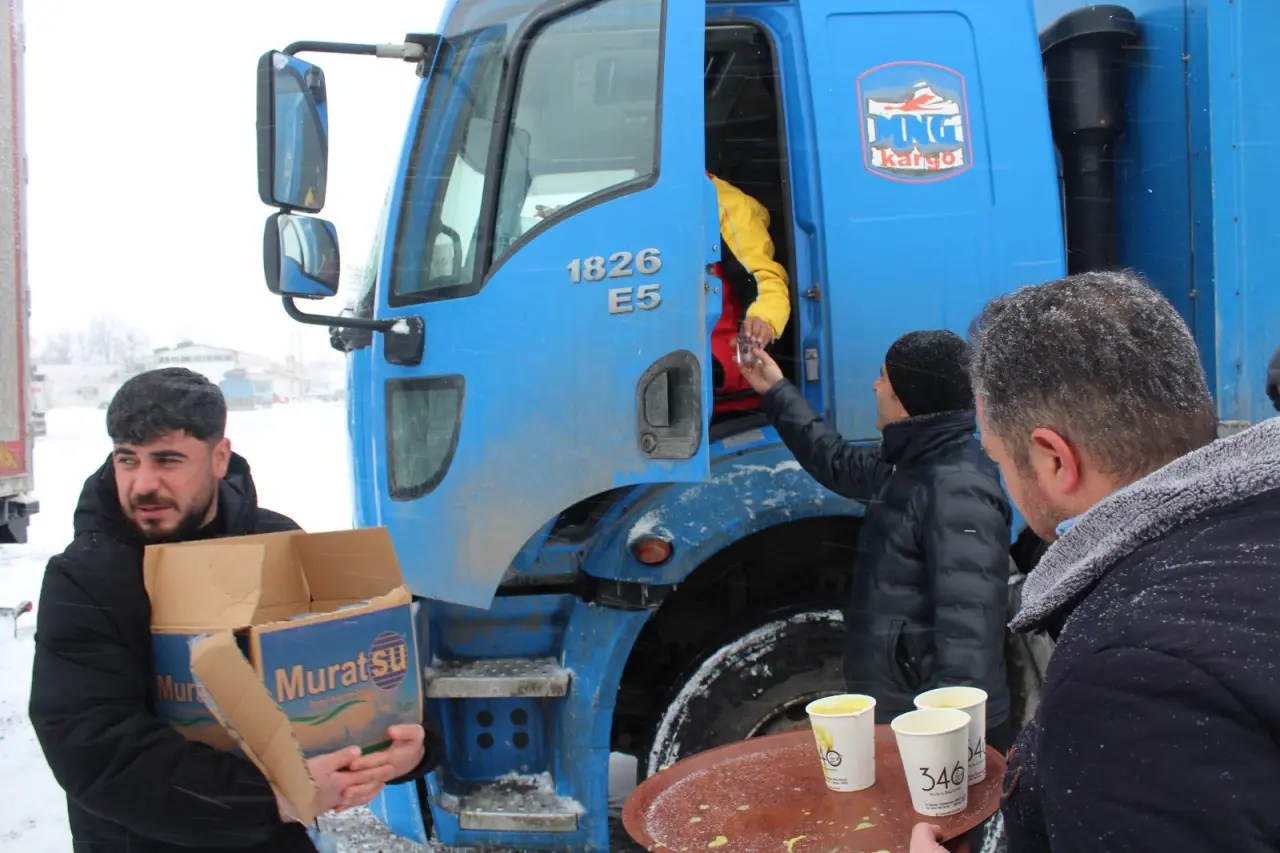 Sivas Belediyesi ekipleri, Taşlıdere’de mahsur kalan vatandaşlara ulaşarak sıcak çorba ve su ikramında bulundu. Özellikle uzun süredir direksiyon başında olan kamyon şoförleri için yapılan bu destek, soğuk havada moral kaynağı oldu.