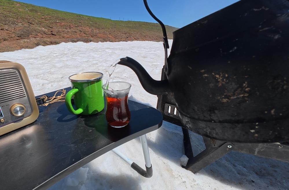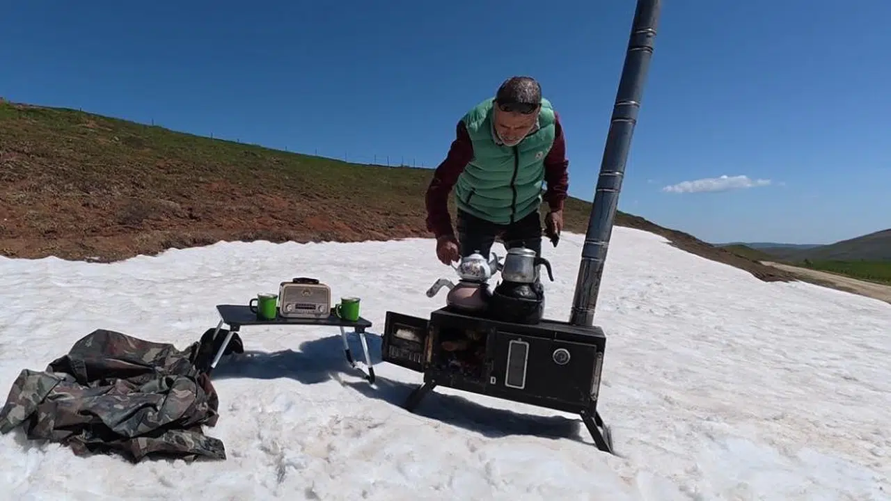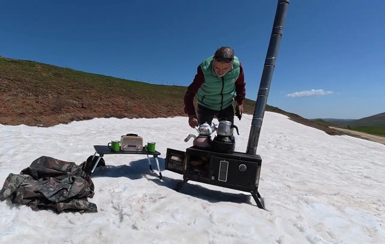 Tokat’ın Başçiftlik ilçesine bağlı Yeniyayla mevkiinde doğasever bir vatandaş, mayıs ayının ortasında kar bulunan yaylada soba kurarak kara demlikte çay demledi. Nazif Karakoç isimli vatandaş, karlar üzerinde kurduğu sobada hem çay demledi hem de patates közleyerek doğanın tadını çıkardı.
