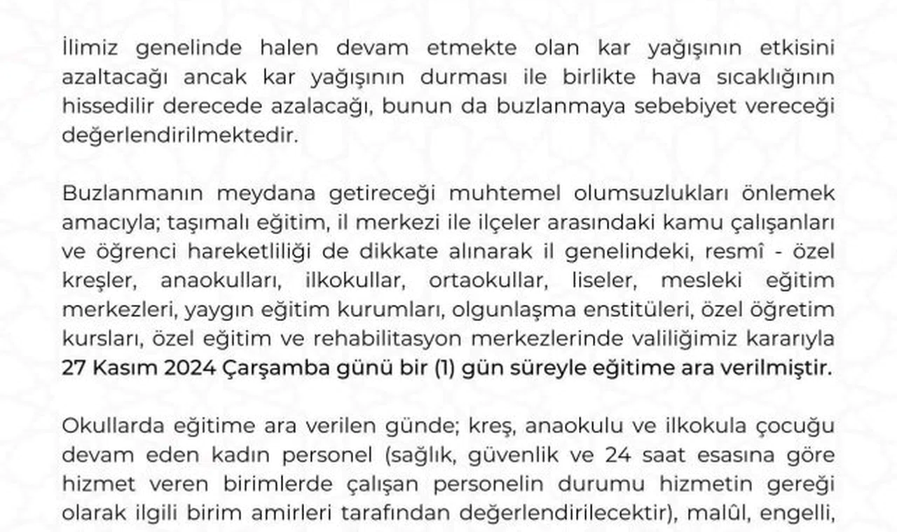 Kayseri Valiliği tarafından yapılan açıklamada, 'İlimiz genelinde halen devam etmekte olan kar yağışının etkisini azaltacağı ancak kar yağışının durması ile birlikte hava sıcaklığının hissedilir derecede azalacağı, bunun da buzlanmaya sebebiyet vereceği değerlendirilmektedir. Buzlanmanın meydana getireceği muhtemel olumsuzlukları önlemek amacıyla; taşımalı eğitim, il merkezi ile ilçeler arasındaki kamu çalışanları ve öğrenci hareketliliği de dikkate alınarak il genelindeki, resmi - özel kreşler, anaokulları, ilkokullar, ortaokullar, liseler, mesleki eğitim merkezleri, yaygın eğitim kurumları, olgunlaşma enstitüleri, özel öğretim kursları, özel eğitim ve rehabilitasyon merkezlerinde valiliğimiz kararıyla 27 Kasım 2024 Çarşamba günü bir 1 gün süreyle eğitime ara verilmiştir. Okullarda eğitime ara verilen günde; kreş, anaokulu ve ilkokula çocuğu devam eden kadın personel (sağlık, güvenlik ve 24 saat esasına göre hizmet veren birimlerde çalışan personelin durumu hizmetin gereği olarak ilgili birim amirleri tarafından değerlendirilecektir), malul, engelli, ağır kronik rahatsız ve hamile kamu çalışanları da idari izinli sayılacaktır. Valiliğimizin resmi sitesi, sosyal medya hesapları ve Valimiz Sayın Gökmen Çiçek'in sosyal medya hesapları dışında yayınlanan bilgilere itibar edilmemesini önemle rica ederiz' ifadelerine yer verildi.