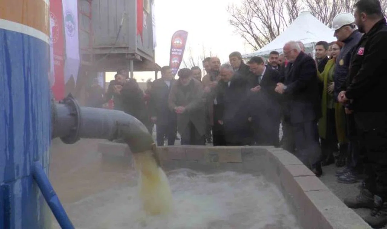 Düzenlenen programda AK Parti Genel Başkanvekili Mustafa Elitaş'ın butona basmasının ardından sondajlanan jeotermal su yüzeye çıktı.