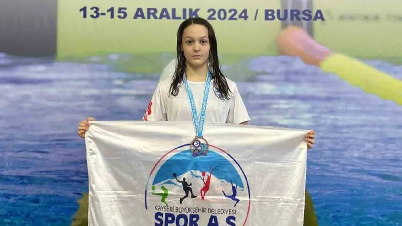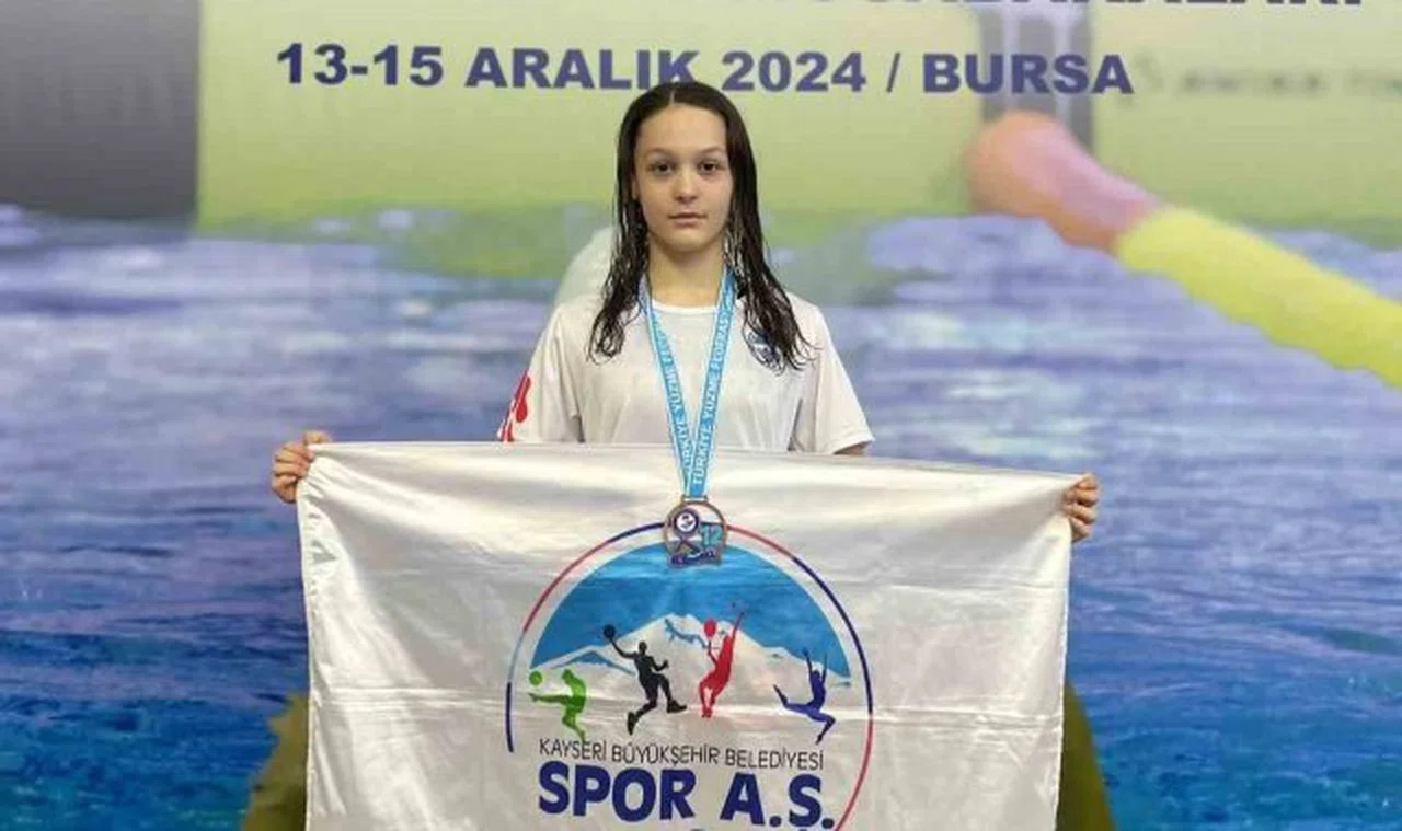 Kayserili sporcu Ela Savaşcı; Bursa'da yapılan Yüzme 12 Yaş Ulusal Gelişim Projesi Ligi Türkiye Finali müsabakalarında bronz madalya alarak A1 barajını aşmayı başardı.