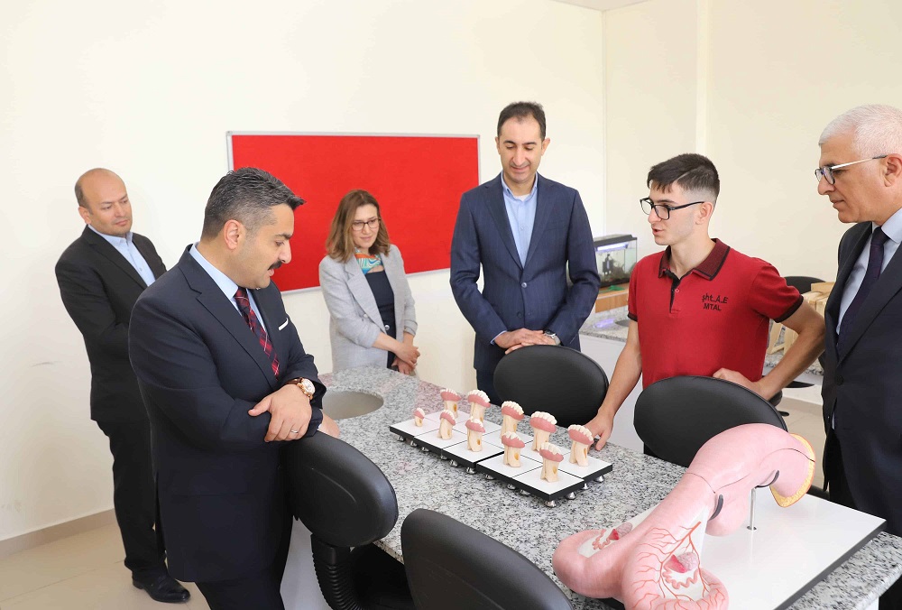 Erdoğan, "Sıfır Atık" projesi kapsamında, kullanım dışı kalmış gıda maddelerinin çeşitli aşamalardan geçirdikten sonra kedi ve köpek maması olarak tekrar kullanıma kazandırılması amacıyla okul bünyesinde oluşturulan kedi ve köpek maması üretim tesisini de ziyaret etti.