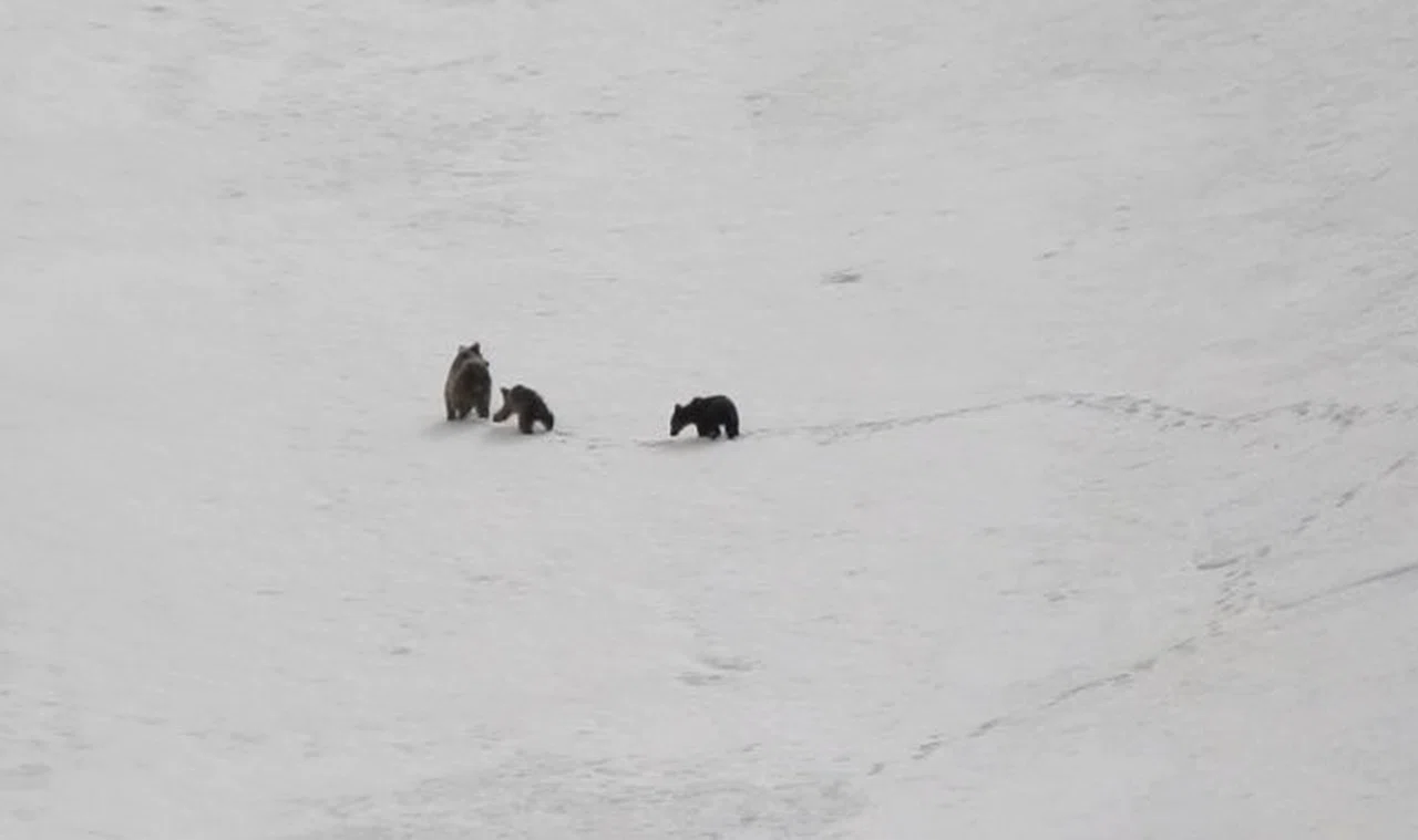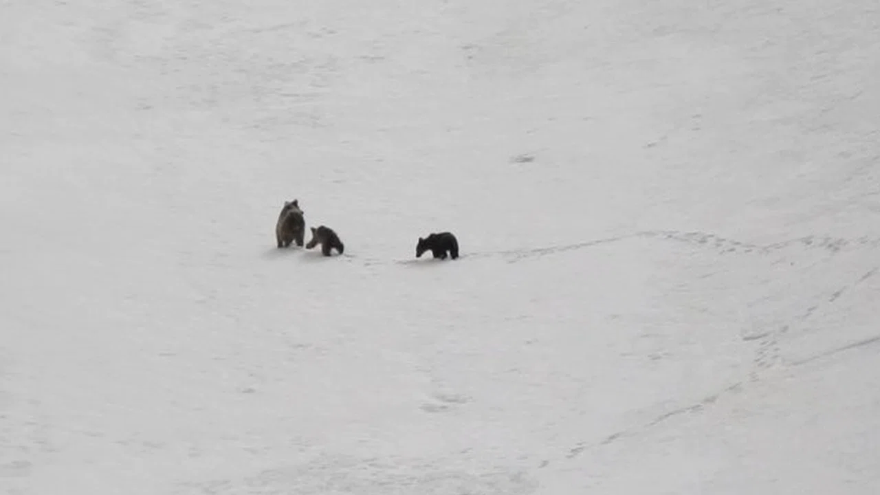 Karla kaplı dağın yamacında büyükçe iki ayının birbiriyle adeta güreşmesi ve bir anne ayının iki yavrusuyla yiyecek araması görüntülerde yer aldı.