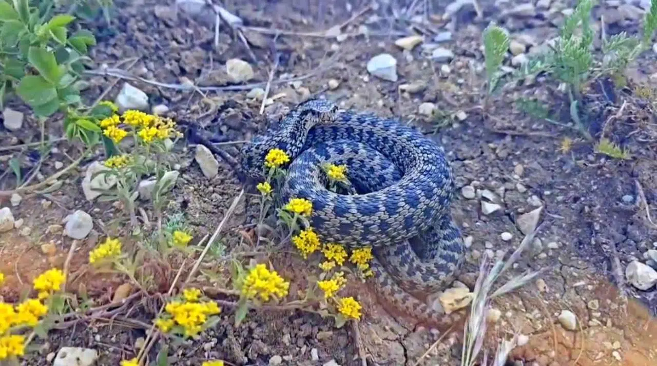 Erzincan’da sıcak havanın iyice artmasıyla birlikte canlanan doğada yılanlar da görülmeye başladı. Çayırlı ilçesine bağlı Çilhoroz köyü yaylalarında çobanlık yapan Mert Yılmaz, sürüsünü otlatırken, Türkiye'nin en zehirli yılan türlerinden engerek yılanını fark etti. Yılmaz, o anları kamerayla kayıt altına aldı. Görüntülenen koca engerek yılanı daha sonra gözden kayboldu.