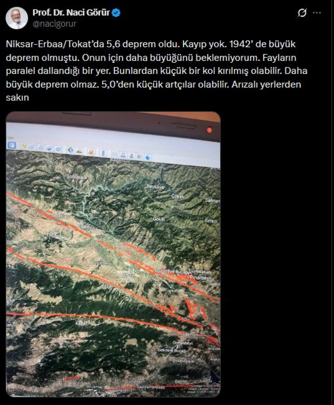 Depremin ardından bölge halkının en büyük endişesi olan "Daha büyüğü olur mu?" sorusu, geçmişteki veriler ışığında yanıt buldu. 1942 yılında bölgede yaşanan yıkıcı depremi işaret eden Görür, o dönemde büyük bir enerji boşalımı gerçekleştiğini vurguladı. Bu tarihi referans alan uzman, Niksar-Erbaa fayı üzerinde şu an için 5.6’dan daha büyük bir deprem beklentisi içerisinde olmadığını net bir şekilde ifade etti.