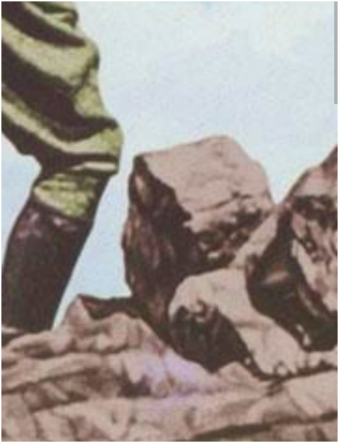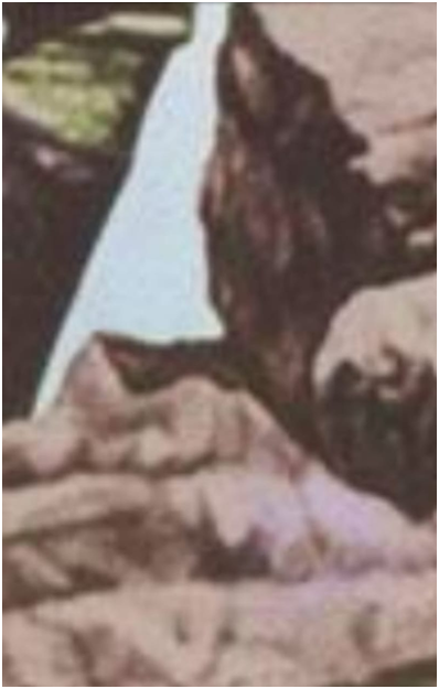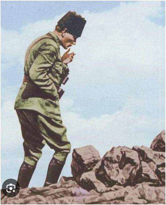 Taşa bu yönden baktığımızda, sol tarafta Gazi Mustafa Kemal’in oradaki verdiği pozun aynısını; sağ tarafta ise Trablusgarp’tayken verdiği bir pozun sakallı yüz portresi yandan ve ağzında çubuğu ile sigarası aynısını görüyorsunuz.