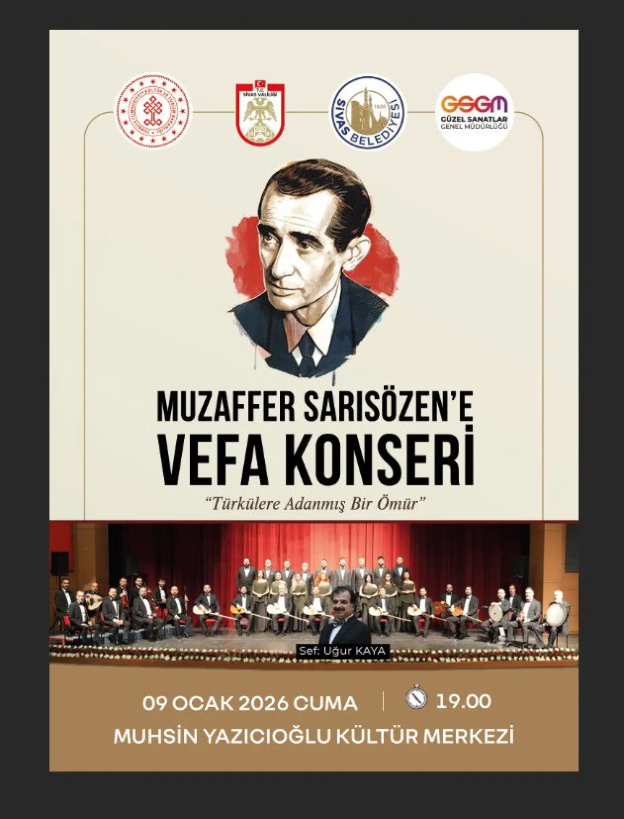 Sivas’ın kültürel takviminde yılın en önemli etkinliklerinden biri olarak gösterilen vefa konseri için tüm hazırlıklar tamamlandı. Sanatın ve müziğin kalbinin atacağı bu büyük buluşma, 09 Ocak 2026 Cuma günü gerçekleştirilecek. Saat 19.00’da başlayacak olan program, Muhsin Yazıcıoğlu Kültür Merkezi’nde kapılarını tüm türkü dostlarına açacak. Katılımın yoğun olması beklenen bu özel gecede, Sarısözen’in derlediği ezgilerle Sivas sokaklarında bir kez daha Anadolu’nun sesi yankılanacak.