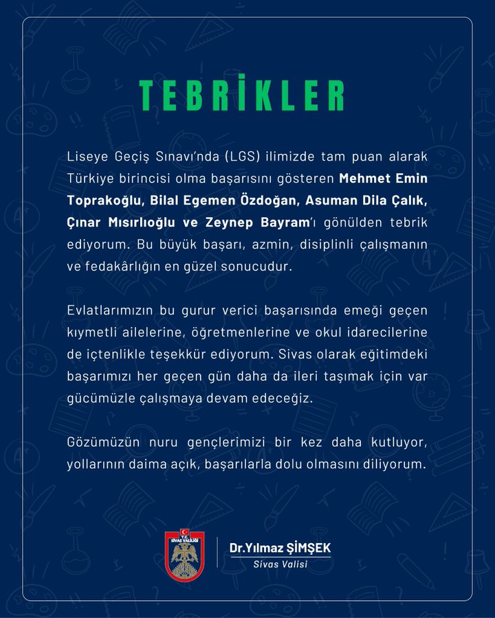 Elde edilen bu önemli başarı, Sivas’ta eğitim kalitesinin geldiği noktayı gözler önüne sererken, Sivas Valisi Dr. Yılmaz Şimşek de başarılı öğrencileri yayımladığı mesajla kutladı. Şimşek, öğrencilerin isimlerini tek tek anarak, gösterdikleri azim, disiplin ve fedakârlığın takdire şayan olduğunu belirtti.