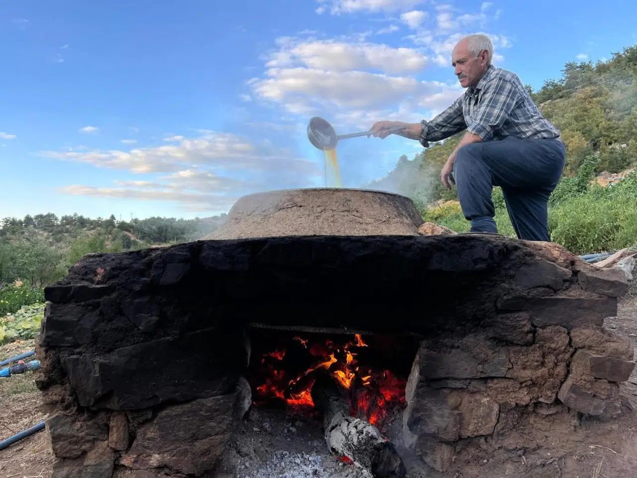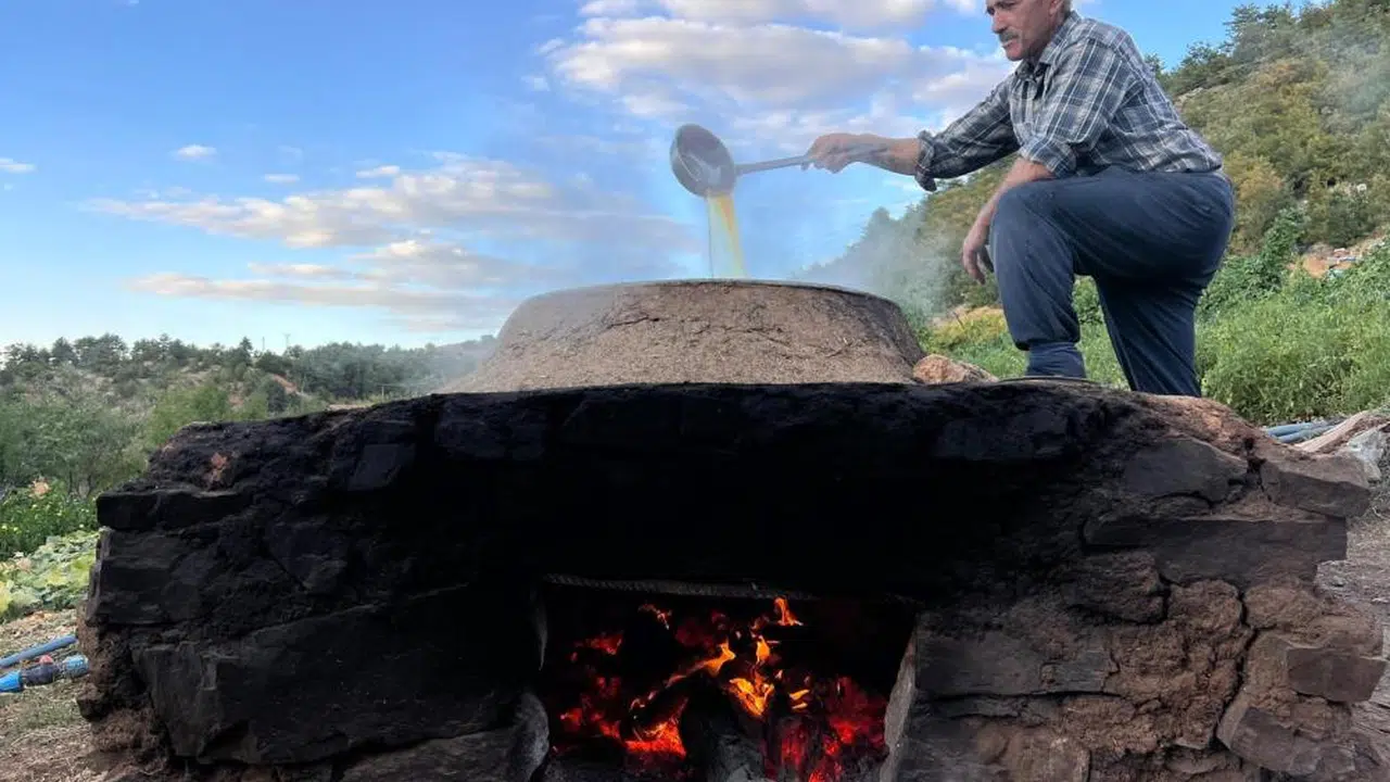 Kahramanmaraş’ın Ekinözü ilçesinde bağ bozumunun tamamlanmasıyla birlikte köylüler, Maraş Kabarcık üzümünden yapılan geleneksel pekmez hazırlığına başladı. Bölgenin meşhur üzümü, eski usul yöntemlerle odun ateşinde kaynatılarak doğal ve katkısız pekmeze dönüşüyor.
