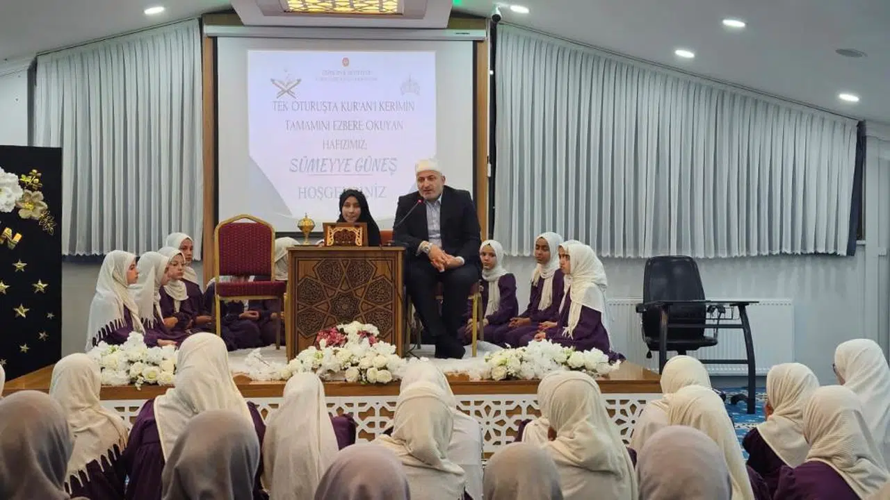 Sümbül Valide Sultan ve Emine Bilen Kız Kur’an Kursunda 2. yılında hafızlık eğitimini tamamlayan öğrenci Sümeyye Güneş bir günde Kur’an-ı Kerimi ezber olarak okuyarak hatim etti.